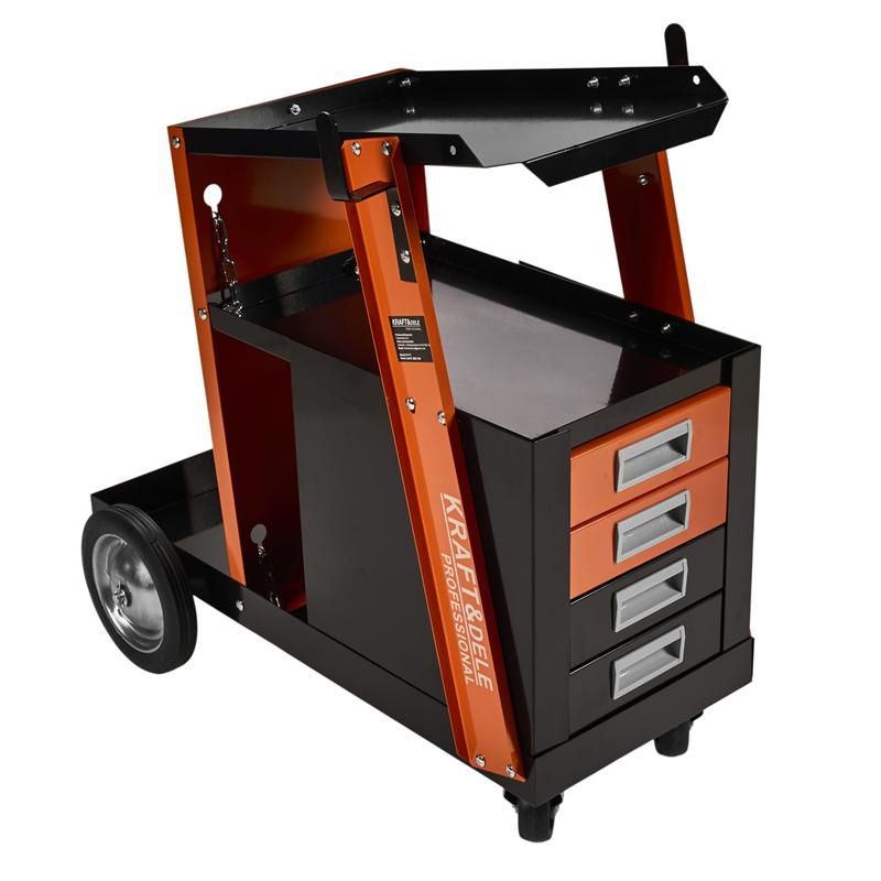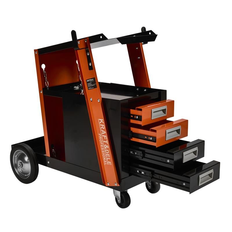 A professzionális hegesztőkocsi ideális megoldás MIG/TIG hegesztőkészletek szállítására és bármilyen műhelyben történő felhasználásra. A kocsi meghosszabbított felső polccal és 4 fiókkal rendelkezik. A masszív és robusztus acélszerkezetnek köszönhetően a kocsi teherbírása akár 75 kg is lehet. A hátul nagyobb, elöl kisebb kerekek megkönnyítik a manőverezést még nagy terhelés mellett is.