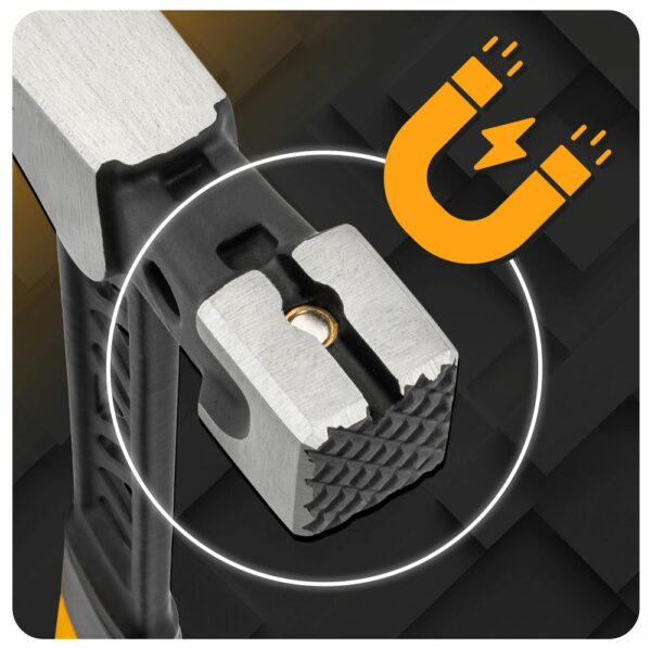 A kalapácsfej mágneses horonnyal van ellátva, amely stabilizálja a szöget, és lehetővé teszi az egykezes beverést. Ez a megoldás jelentősen felgyorsítja a munkát, növeli a pontosságot és javítja a biztonságot, különösen magasban végzett munka esetén. A dupla fogazású ék lehetővé teszi a szögek egyszerű eltávolítását kisebb anyagkárral és nagyobb erőkifejtéssel.