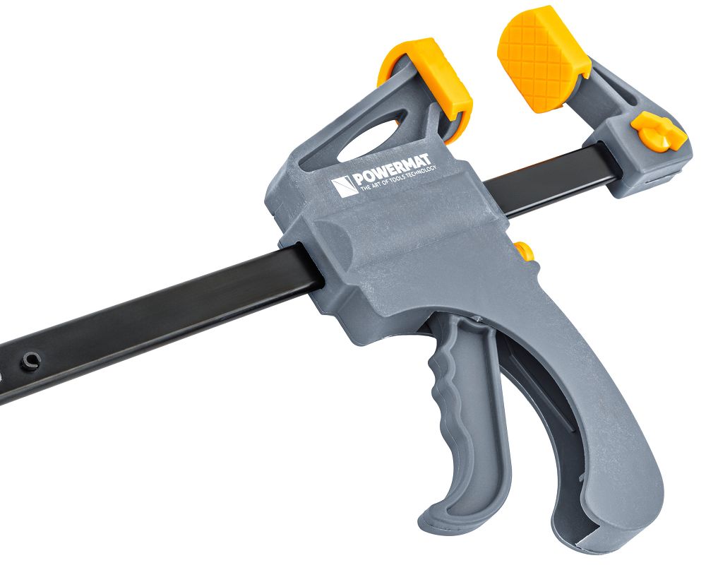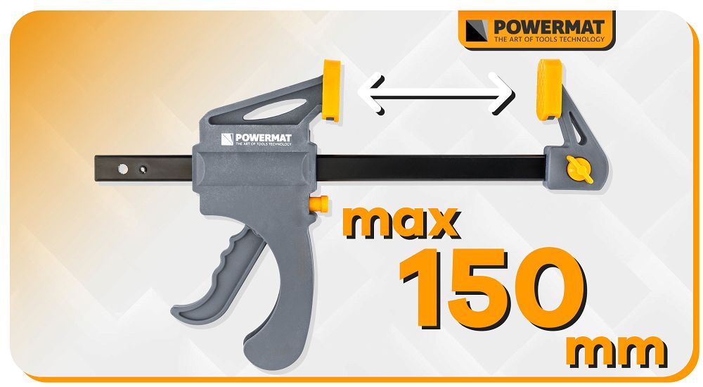 Az ácsszorító, 150x60mm | PM-SSD-6T klasszikus szorítóként és a kar ellentétes oldalra mozgatásával feszítőként is használható. Ez lehetővé teszi nemcsak az elemek összenyomását, hanem a tágulásuk szabályozását is, például keretek, ajtókeretek vagy szekrényszerkezetek összeszerelésekor. A szorító teljes hossza 34 cm, ami jó egyensúlyt biztosít a munkatartomány és a szerszámkezelés között.