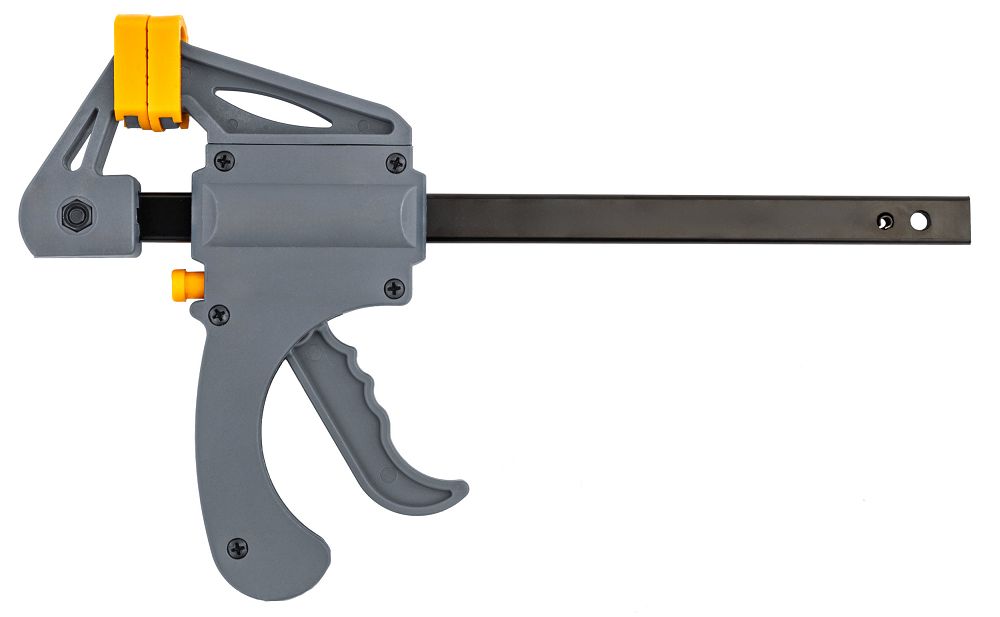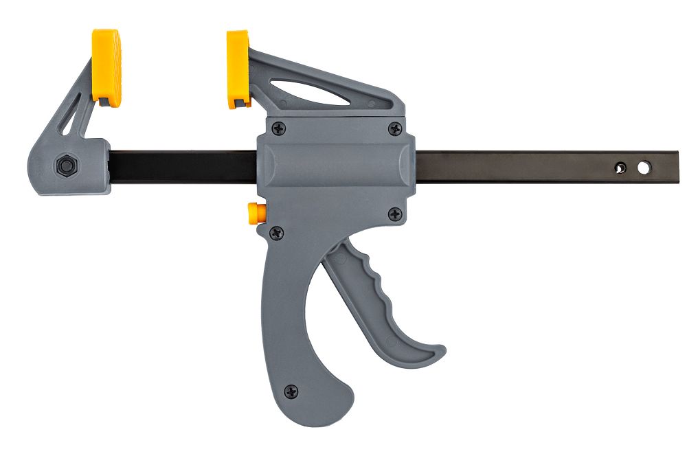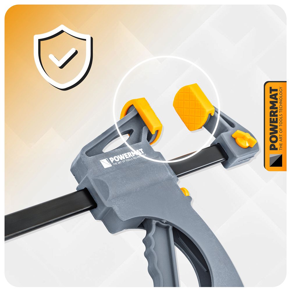 A karmechanizmus egyenletes nyomást biztosít az elem elmozdulásának kockázata nélkül. A szerszám stabilan működik, a pofa mozgása pedig kontrollált és ismétlődő még a későbbi alkalmazásokban is. A pofákon található puha védőburkolatok védik a felületet a karcolásoktól és a deformációtól. Ezáltal a szerszám biztonságosan használható fa, fém és befejező elemekhez.