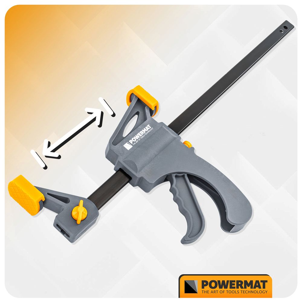 Az ácsszorító, 300x60mm | PM-SSD-12T klasszikus szorítóként vagy feszítőként is használható a kar ellentétes oldalra mozgatásával. Ez lehetővé teszi nemcsak az elemek összenyomását, hanem a tágulásuk szabályozását is, például keretek, ajtókeretek vagy szekrényszerkezetek összeszerelésekor. A kompakt, 490 mm-es teljes hossza megkönnyíti a szerszám kezelését szűk helyeken. Ugyanakkor a kialakítás stabil és terhelésálló marad.