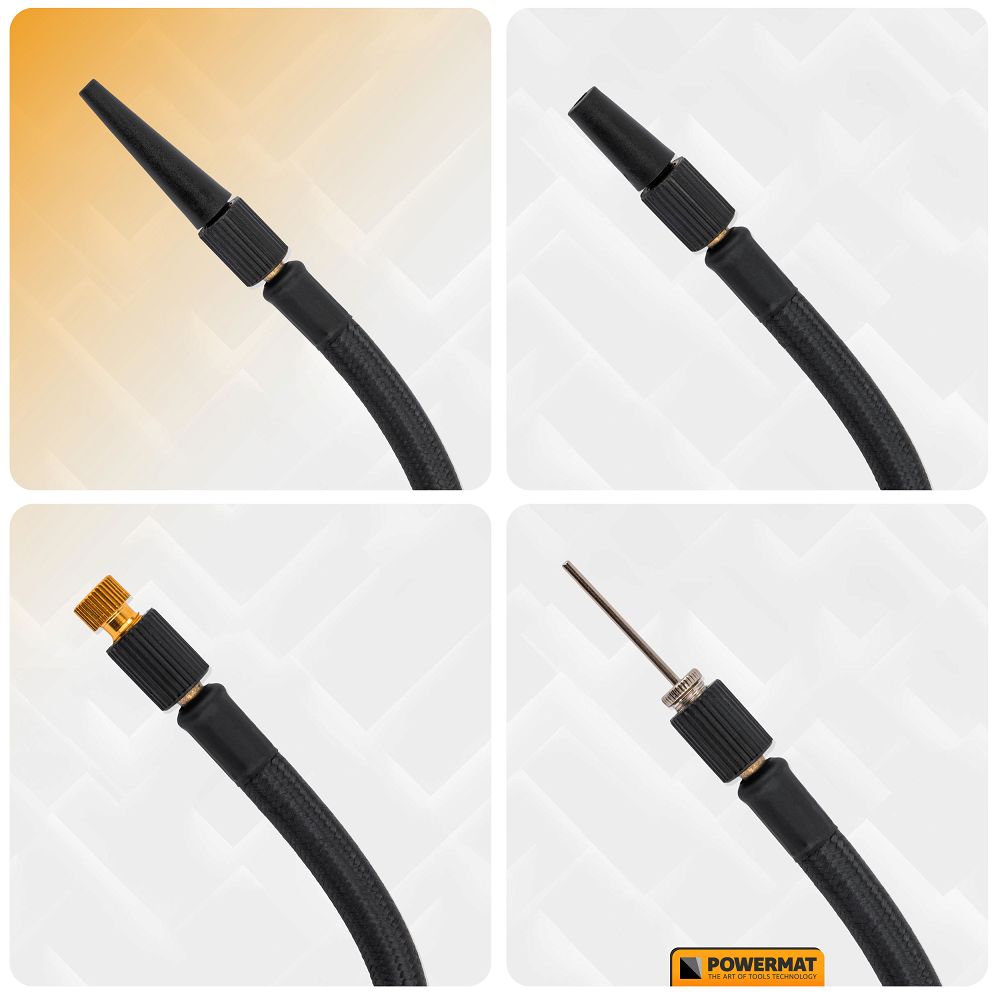 A kompresszor cserélhető szelephegyekkel rendelkezik, amelyek lehetővé teszik a szerszám pontos illesztését a különböző típusú szelepekhez. A pumpa egy integrált Schrader szeleppel rendelkezik, amely közvetlenül a tömlőn található, így gyorsan és biztonságosan csatlakoztatható a szabványos autóipari szelepekhez. Ez megkönnyíti az autó- és motorkerékpár-abroncsok felfújását.