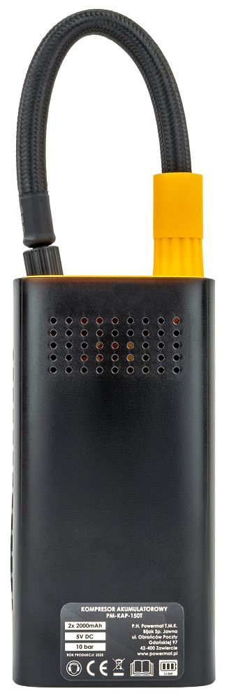 Autós kompresszor, 80W | A PM-KAP-150T egy hordozható eszköz gumiabroncsok, labdák vagy felfújható játékok gyors felfújására külső tápellátás nélkül. A készülék 80 W teljesítményt és 10 bar / 150 PSI maximális nyomást kínál, amely garantálja a különféle típusú gumiabroncsok és kiegészítők gyors és hatékony felfújását. 4000 mAh (2×2000 mAh) kapacitású akkumulátorral van felszerelve, amely lehetővé teszi a mobil működést anélkül, hogy állandó hálózati csatlakozásra lenne szükség.