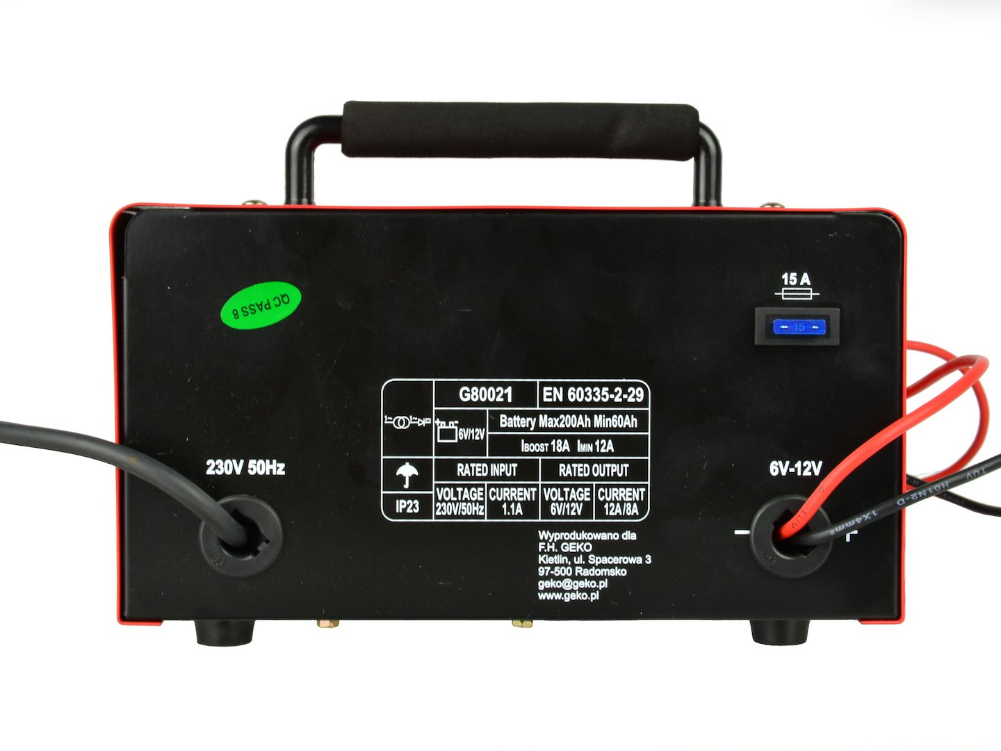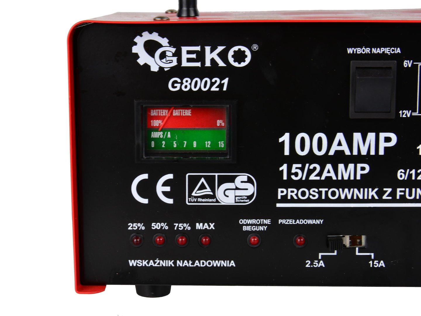 A GEKO autós töltő indítóval, 100A, 6/12V, lemerült akkumulátorok töltésére és gyors újraélesztésére szolgál autókban vagy motorkerékpárokban. Az indító funkcióval ellátott töltő 6 V vagy 12 V feszültségű ólomakkumulátorok indítására és töltésére szolgál, amelyeket többek között személygépkocsikban, motorkerékpárokban, hajókban stb. használnak.