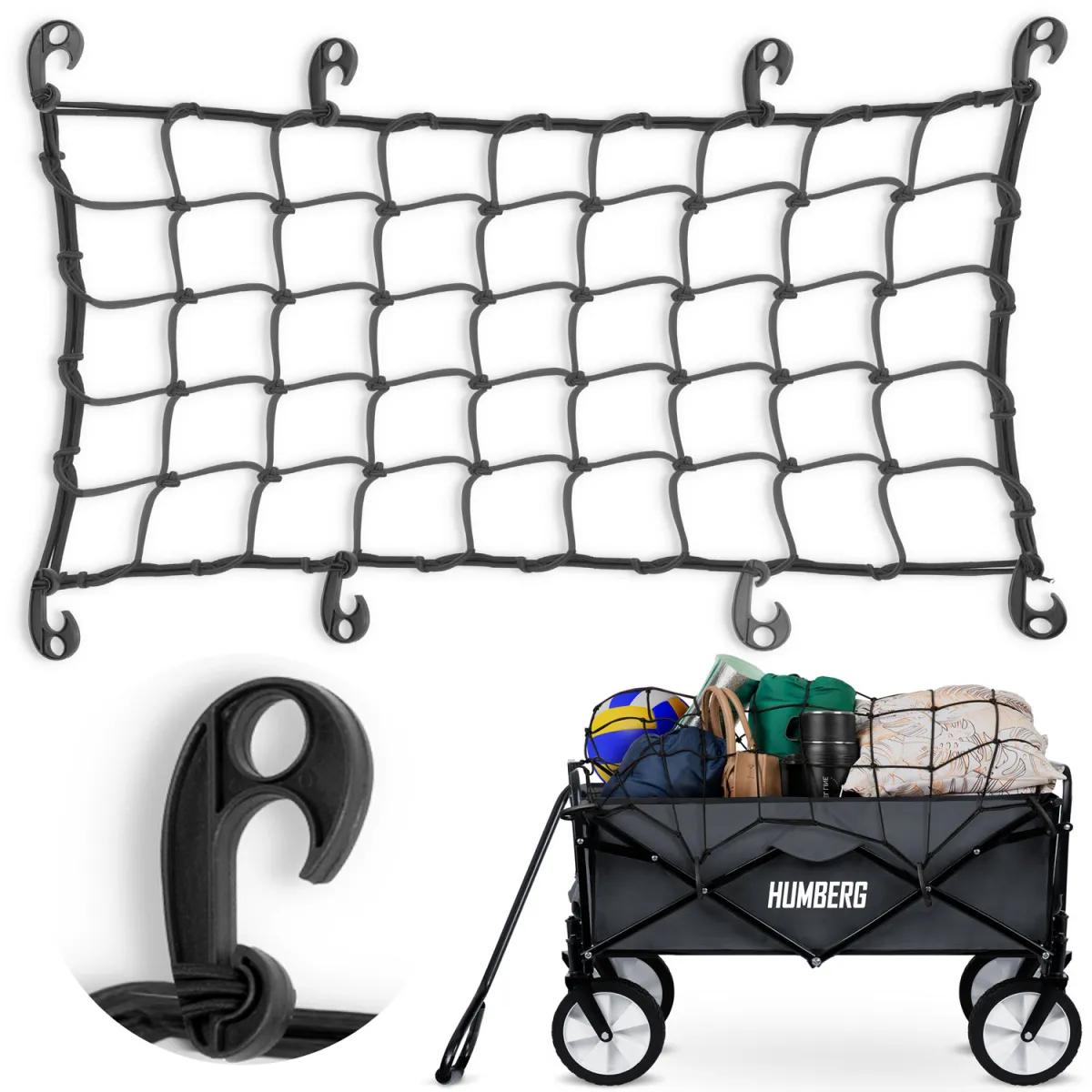 A 90x52cm-es biztonsági háló kocsikhoz | Humberg a rakomány stabil rögzítésére szolgál mozgás közben, és 8 kampóval rendelkezik a stabil rögzítéshez. Erős, rugalmas anyagból készült, és a rögzítőkampóknak köszönhetően tökéletesen véd a tárgyak kiesése ellen menet közben, még egyenetlen terepen is. Univerzális kialakításának és méretének köszönhetően számos Humberg kocsi modellhez és más, kompatibilis méretű kocsikhoz alkalmas. HM-511, HM-512, HM-513 modellekhez illik.
