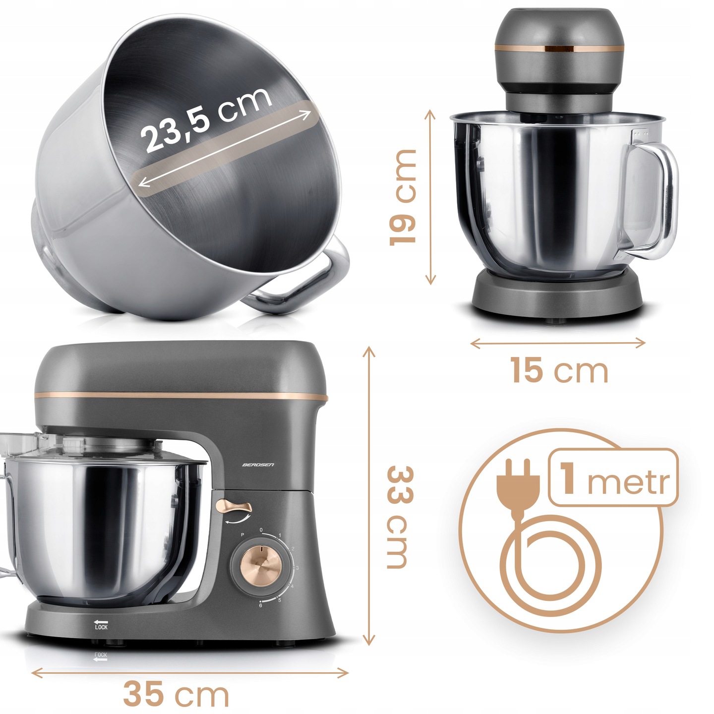 A nagy, 6 literes rozsdamentes acél tál elegendő helyet kínál még nagyobb mennyiségű tészta vagy krém számára is, amit nagyobb mennyiségek sütésekor értékelni fog. A robot 6 sebességfokozatot, valamint PULSE üzemmódot kínál – ez lehetővé teszi a sebesség pontos beállítását az elkészítendő keverék típusához, akár habverést, dagasztást vagy keverést végez.