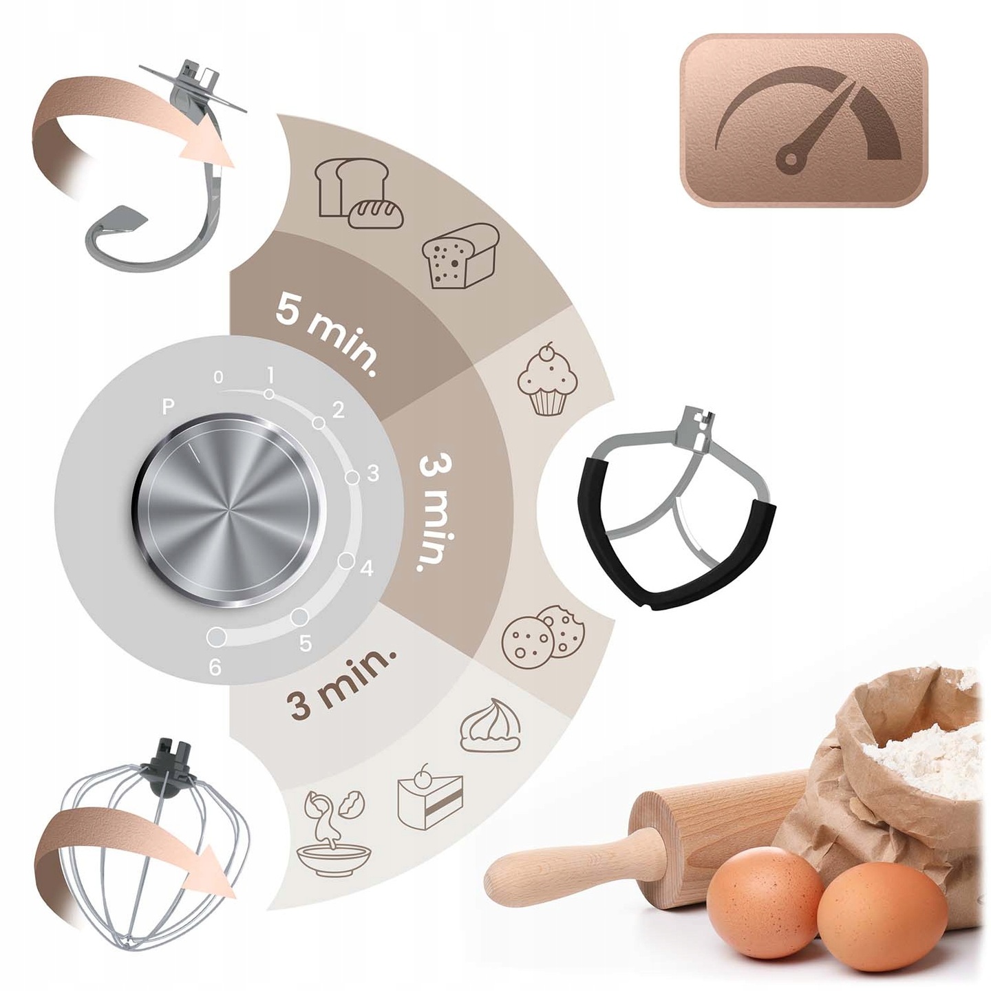 A csomag számos tartozékot tartalmaz (dagasztóhorog, keverőgép, habverő), így a robot mindent meg tud oldani az élesztős vagy kenyértésztától kezdve a krémeken át a habos tejszínhabbal is. Minden tartozéknak más a célja – az ideális sebesség, a tökéletes eredmény. A dagasztóhorog 1-3-as sebességfokozaton működik a legjobban, a tejszín- és töltelékkeverő a 2-4-es beállításon a leghatékonyabb, a habverő pedig 5-6-os sebességfokozaton éri el teljes potenciálját – mindig tökéletes állaggal.