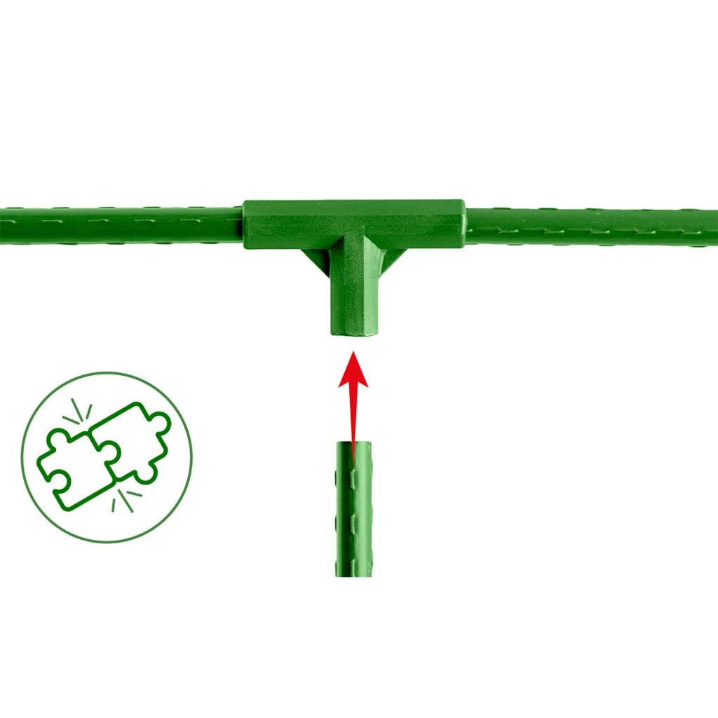 A PL-941 támasztórudakhoz való csatlakozók, 3-as típus, 4 db, 11 mm, zöld | A Plonos megoldást kínálnak a támasztórudak gyors és stabil csatlakoztatására a kertben vagy az üvegházban. Lehetővé teszik a 11 mm átmérőjű rudak egyszerű csatlakoztatását és különféle támaszok, például oszlopok, rácsok vagy alagutak létrehozását a növények termesztéséhez. A moduláris kialakítás leegyszerűsíti az összeszerelést és a szétszerelést, így a támaszokat az igényeihez igazíthatja, és a szezon után könnyen szétszerelheti és tárolhatja őket.