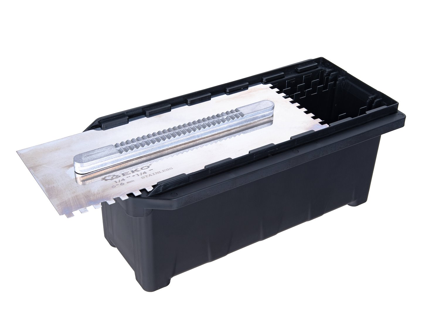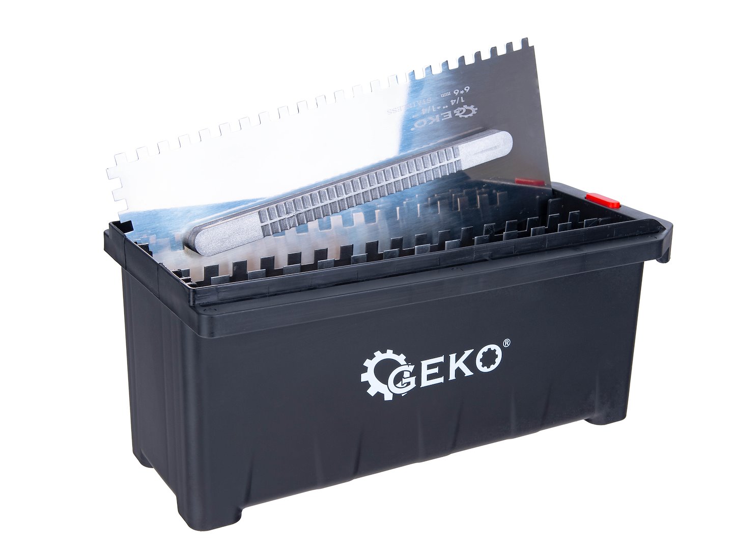 A csemperagasztó felhordó készlet, 280x115mm | GEKO tartalmazza a szükséges eszközöket, amelyek leegyszerűsítik a burkoló mindennapi munkáját. A készlet 6 cserélhető fésűt tartalmaz különböző fogakkal, egy gyorszáras fogantyút és egy praktikus szállítódobozt. Minden simító mérete 280 x 115 mm, így ideálisak mind nagyobb, mind kisebb felületekhez.