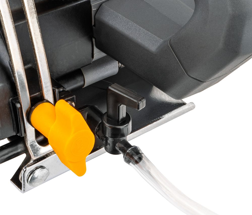 A vágó teljes funkcionalitást kínál mind nedves, mind száraz vágási módban, lehetővé téve az anyag típusához ideális munkamódszer kiválasztását. A vízhűtéses rendszer csökkenti a penge túlmelegedésének kockázatát, korlátozza a porképződést és javítja a munkakörülményeket, biztosítva a sima és tiszta vágásokat még hosszú távú használat során is. A vágófej és a védőburkolat vastag öntöttvasból készült, a tömör acél alaplap pedig garantálja a sérülésekkel és deformációval szembeni nagyfokú ellenállást.