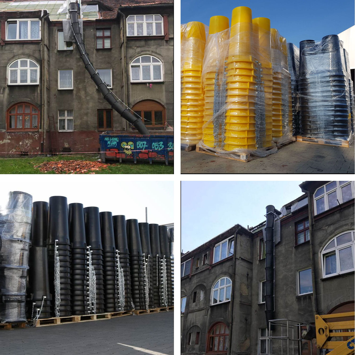 Az építési törmelékcsúszda, 10m, fekete | HIGHER egy praktikus megoldás az építési hulladék biztonságos és zökkenőmentes elszállítására az újjáépítési és építési munkálatok során. Fix moduláris szegmensekből áll, amelyek a kívánt hosszúságú (jelen esetben 10 m) csúszdává csatlakoztathatók, így az anyag stabilan leereszthető anélkül, hogy a térben szétszóródna vagy porosodna.