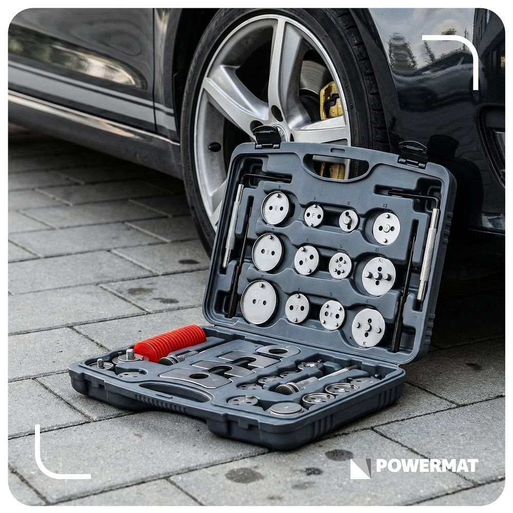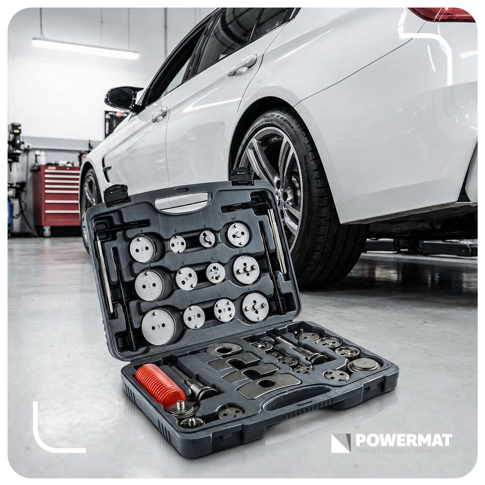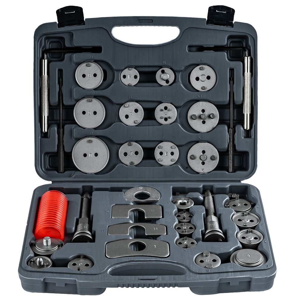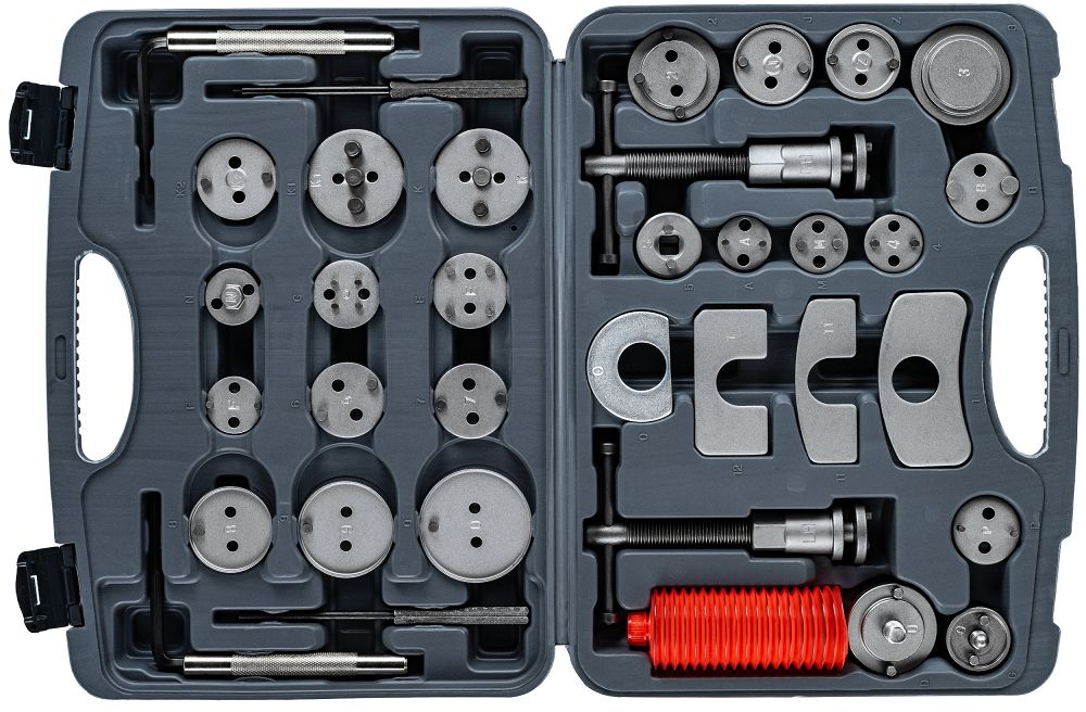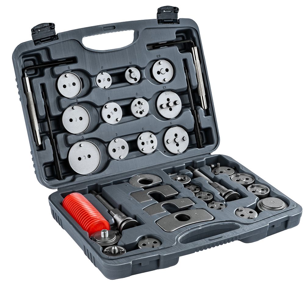 A fékdugattyú préskészlet, 35 darabos | PM-ZWT-35T praktikus eszközöket tartalmaz az autó fékrendszerének szervizeléséhez. A 35 alkatrésznek köszönhetően, beleértve a jobb és bal oldali adaptereket és préseket, számos modellhez igazíthatja. Precíz munkát, a fékbetétek könnyebb beszerelését és időt takaríthat meg a sérülés kockázata nélkül. A 28 adapternek köszönhetően könnyen adaptálhatja a szerszámot különböző féknyergekhez. Univerzális megoldást kap, és nem kell időt pazarolnia a nem megfelelő alkatrészek kombinálására.