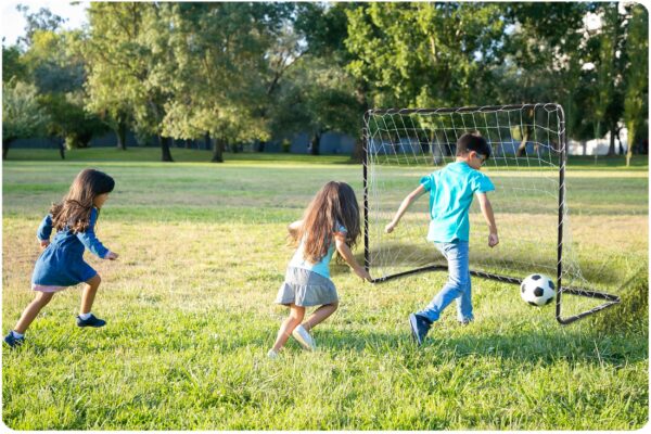 A kapu könnyű (3 kg), ami lehetővé teszi a könnyű szállítást, és a “klikk” rendszernek köszönhetően gyorsan összecsukható szerszámok nélkül. A csomag négy rögzítőcsapot is tartalmaz, amelyek növelik a stabilitást a játék során. Ez a kapu nagyszerű választás azoknak a családoknak, akik minőségi és biztonságos felszerelést keresnek otthoni futballtevékenységekhez.