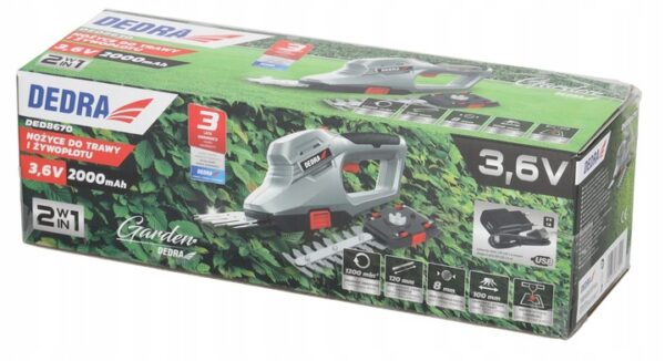 Fű-/Sövénynyíró olló, 3,6 V | A DEDRA egy kerti szerszám, amely lehetővé teszi a gyepszélek precíz vágását, valamint cserjék vagy sövények formázását. A 2 az 1-ben kialakítás lehetővé teszi a fű- és sövénynyíró olló közötti egyszerű váltást, így a szerszám gyorsan alkalmazkodik az adott feladatokhoz.