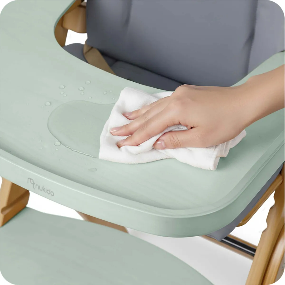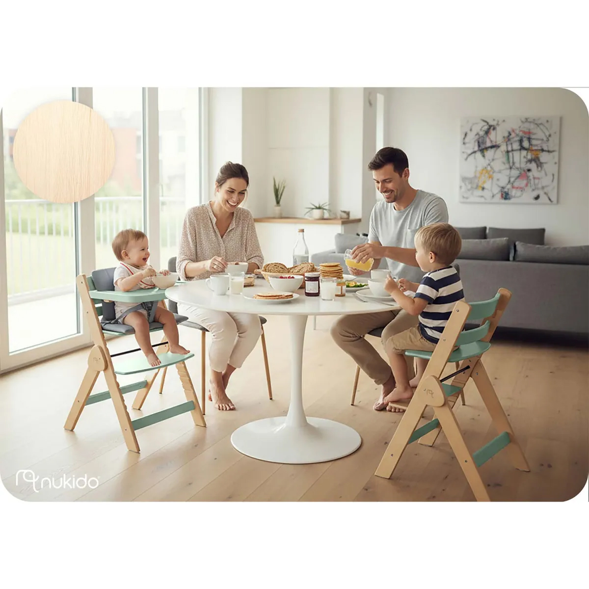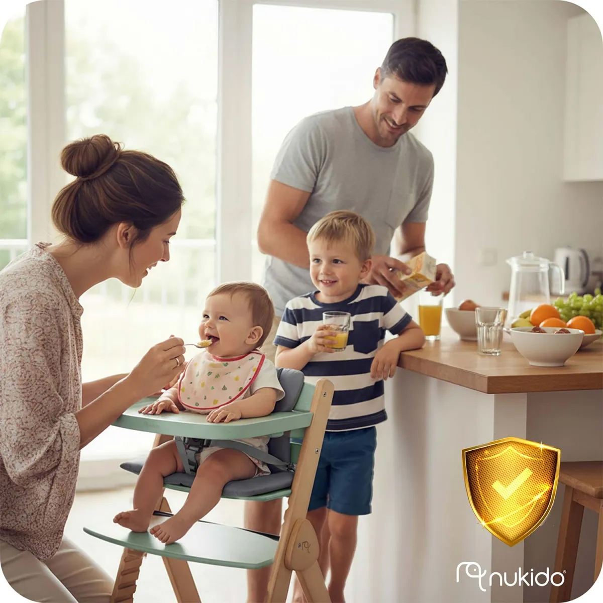Gyerek étkezőszék Timo 2 az 1-ben, zöld | Nukido egy stabil és biztonságos etetőszék, amely kényelmes és önálló ülést biztosít az asztalnál. A speciális biztonsági öveknek és a kényelmes párnának köszönhetően biztonságos és kényelmes első székké válik gyermeke számára. Ideális az első étkezésekhez és a közös asztali pillanatokhoz. Ha gyermeke nagyobb lesz, egyszerűen vegye le a tálcát, és állítsa be az ülés és a lábtartók magasságát.