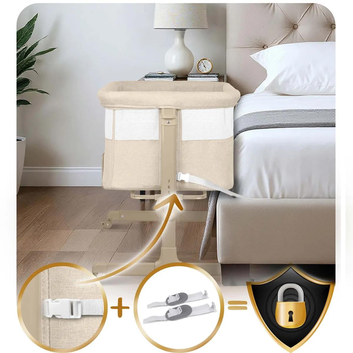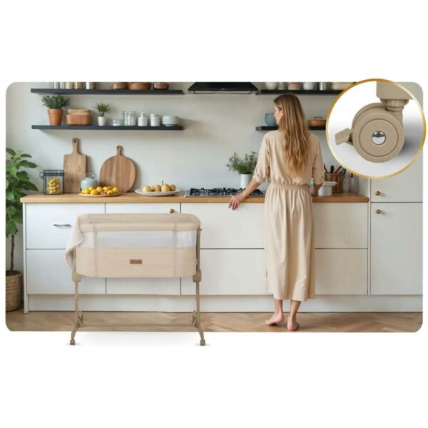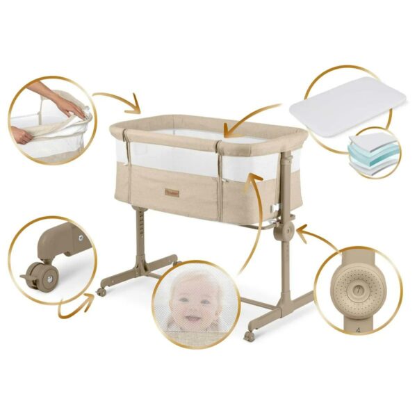 A stabil szerkezet biztonságot nyújt, míg a 4 fékezős kerék könnyed mozgást tesz lehetővé. Az oldalsó hozzáférés levehető és zárható, így a gyermek nem tud egyedül kiszállni, a huzatok és a szövetrészek pedig levehetők és moshatók, ami megkönnyíti a karbantartást. A csomag tartalmaz egy levehető huzatú matracot is, amely kényelmet biztosít a gyermek számára.
