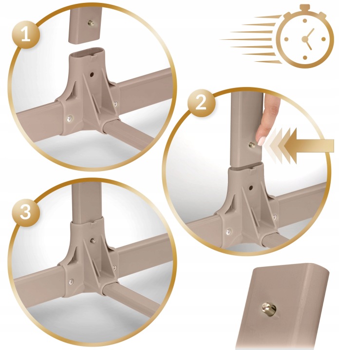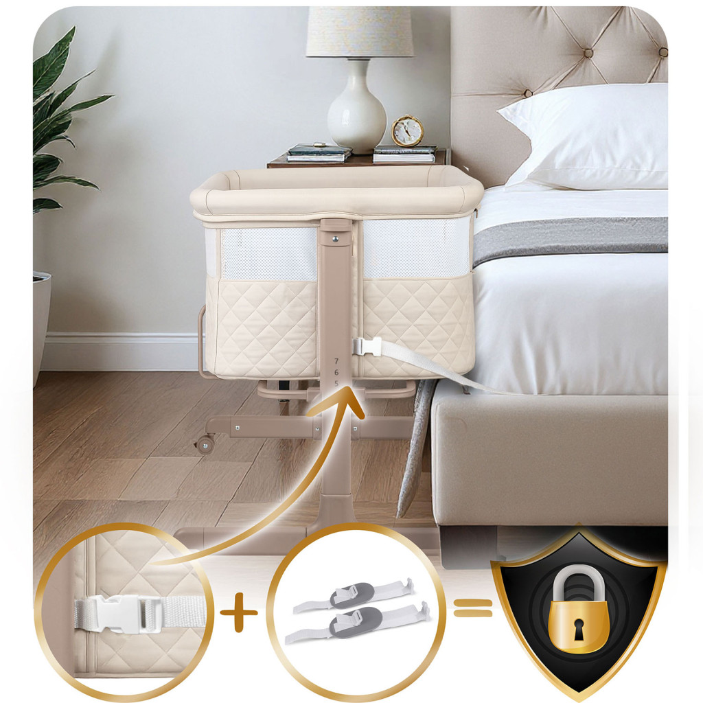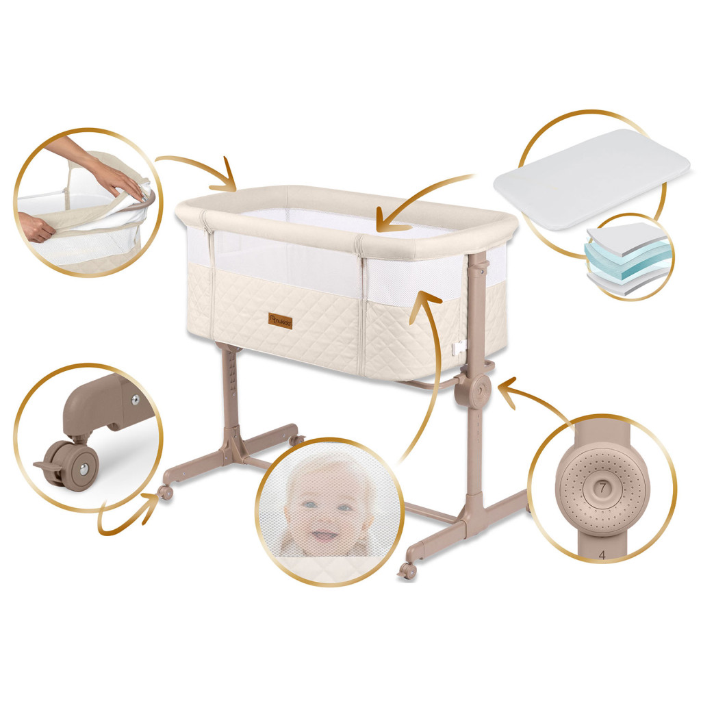 A stabil szerkezet biztonságot nyújt, míg a 4 fékezős kerék könnyed mozgást tesz lehetővé. Az oldalsó hozzáférés levehető és zárható, így a gyermek nem tud egyedül kiszállni, a huzatok és a szövetrészek pedig levehetők és moshatók, ami megkönnyíti a karbantartást. A csomag tartalmaz egy levehető huzatú matracot is, amely kényelmet biztosít a gyermek számára.