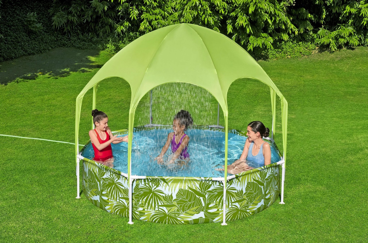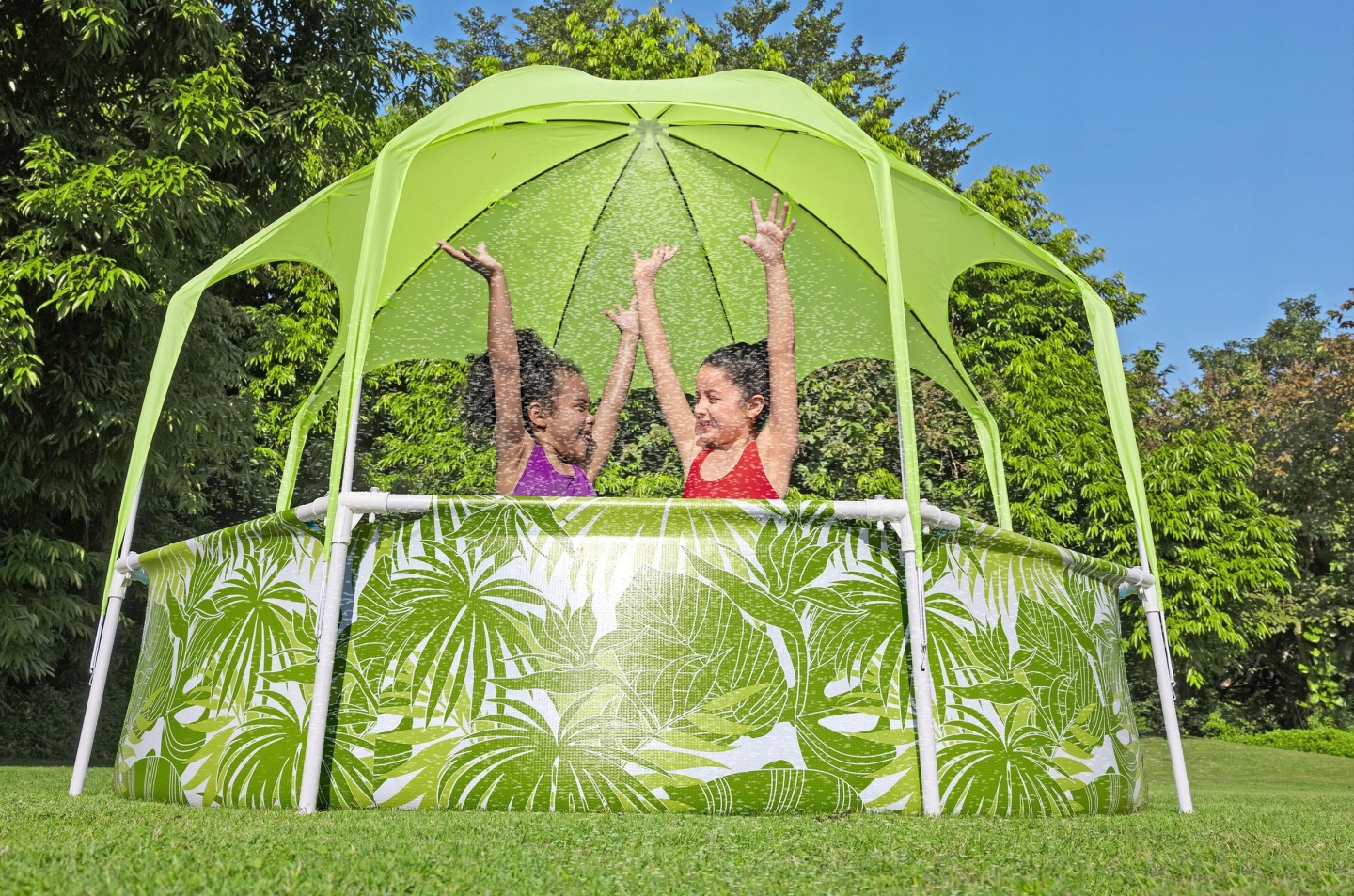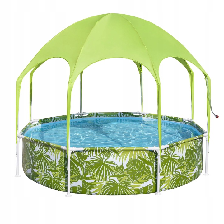 Gyermekmedence ponyvával, 244x51cm | Bestway praktikus megoldást kínál a nyári felfrissülésre, és egyúttal védelmet nyújt a nap ellen úszás közben. A masszív fémszerkezet stabilitást és tartósságot biztosít használat közben. Az integrált ponyvák védelmet nyújtanak a napfény ellen, és növelik a kényelmet a forró napokon történő úszás közben. Tartalmaz egy vízpermetezőt is, amely kerti tömlőhöz csatlakoztatva élvezetesebbé teszi a medencében tartózkodást. A többrétegű anyagból készült tartós falak hosszabb élettartamot és biztonságos használatot biztosítanak.
