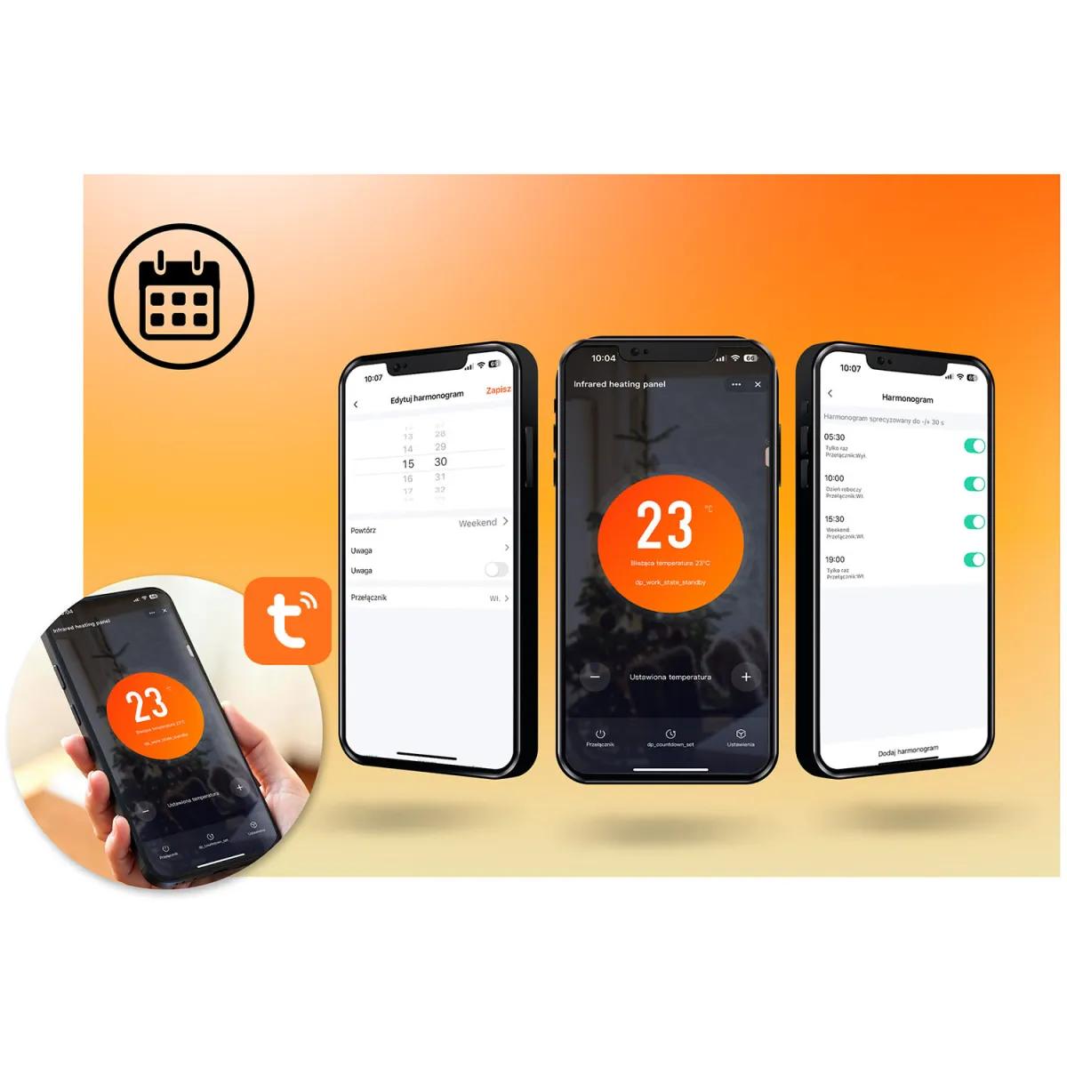 A telefonon található Tuya Smart alkalmazással, amely vezeték nélküli Wi-Fi hálózaton keresztül csatlakozik a panelhez, könnyedén vezérelheti otthona fűtését bárhonnan. Az alkalmazással könnyedén módosíthatja a beállításokat, szabályozhatja a hőmérsékletet és az időzítőt, valamint ütemezheti a működést, így a körülményeket az igényeihez igazíthatja. Ez a rugalmas megoldás kényelmet és energiamegtakarítást biztosít az intelligens fűtésvezérlés lehetővé tételével.