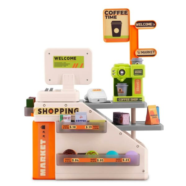 A készlet tartalmaz még egy kávéfőzőt, egy vonalkódolvasót, egy realisztikus szkennerrel ellátott pénztárgépet, egy fiókot érmék és bankjegyek számára, egy mikrofont, valamint hang- és fényeffektusokat, amelyek fokozzák a játék hiteles élményét. A kiváló minőségű kidolgozásnak és a biztonságos anyagoknak köszönhetően a pénztárgép három éves kortól alkalmas gyermekek számára. A játék nemcsak szórakoztatja a gyerekeket, hanem megtanítja a matematika, a kommunikáció és az együttműködés alapjait is, így ideális ajándék kis eladóknak vagy kereskedőknek.