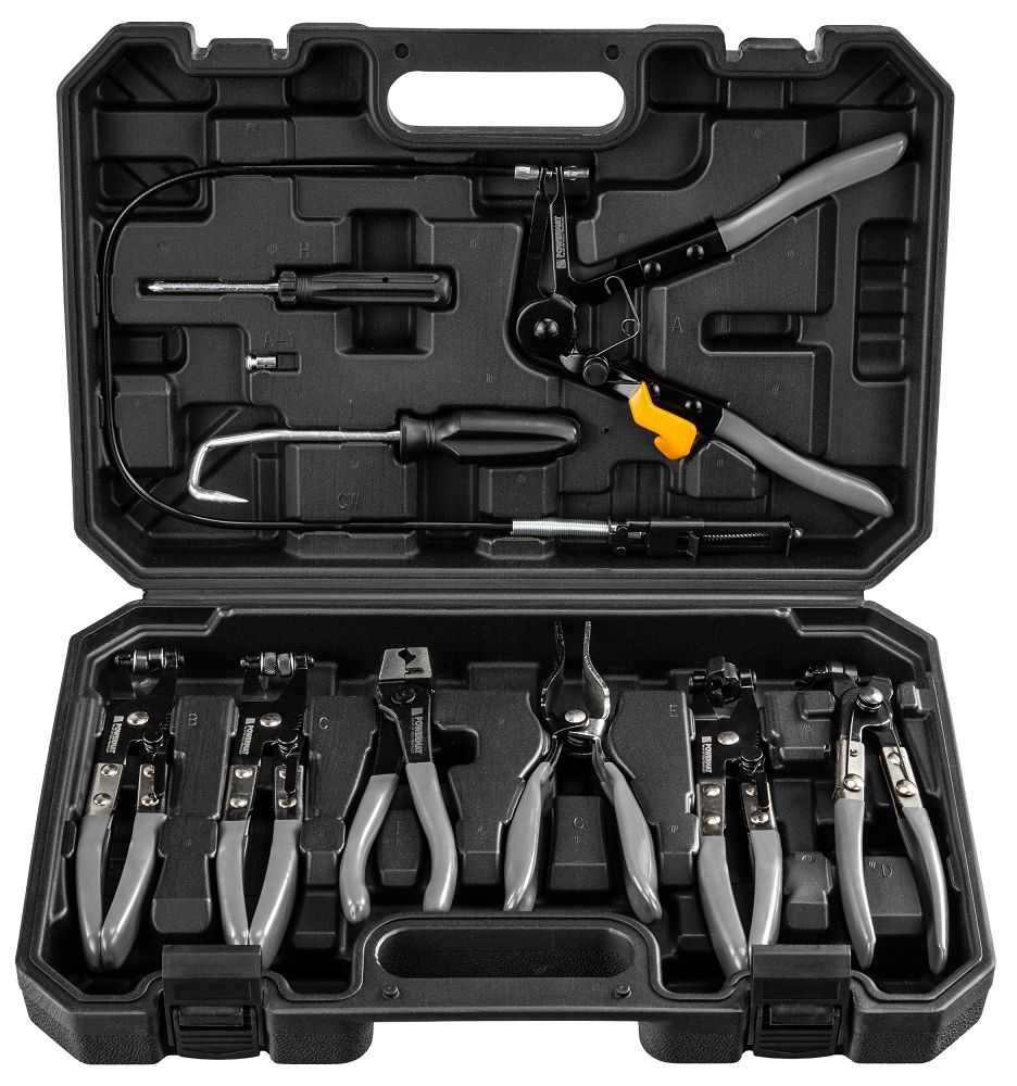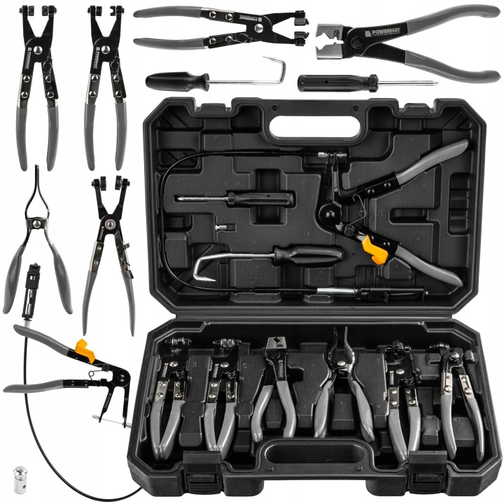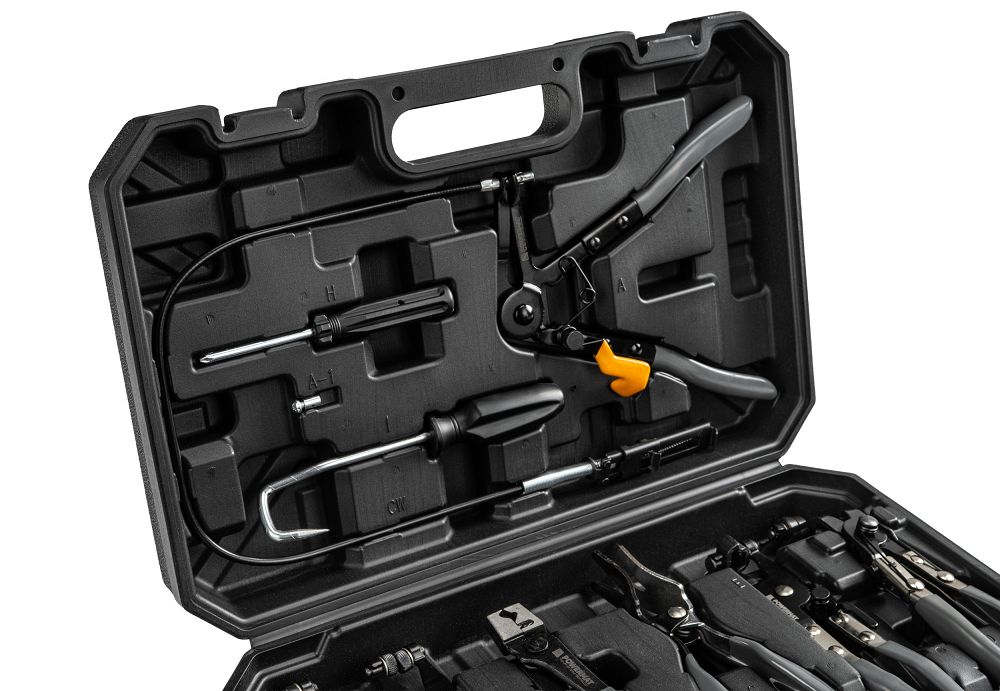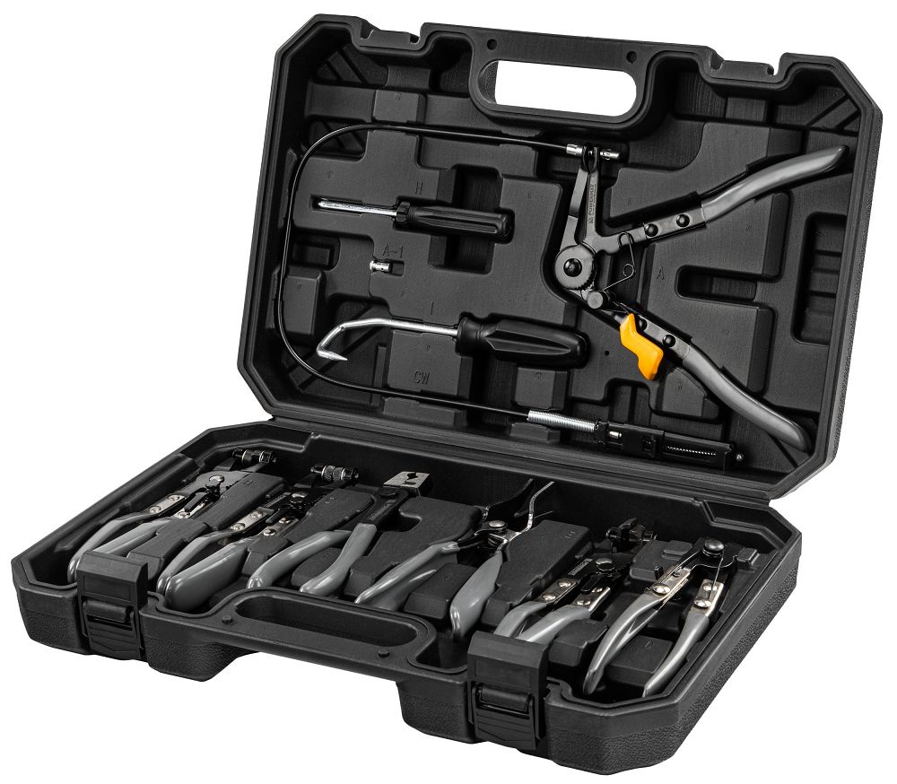 A készlet szerszámokat tartalmaz rugós bilincsekhez, CLIC/CLIC-R, Oetiker és drótkötözőkhöz, így nem kell több készletet vásárolnia. Az újrafelhasználható és eldobható bilincseket meglazíthatja, meghúzhatja és újra felszerelheti. Ez rugalmasságot biztosít a különböző autómárkákkal való munkavégzéshez, beleértve a népszerű európai modelleket is. Egy készlet a motortérben előforduló legtöbb bilincshez elegendő.