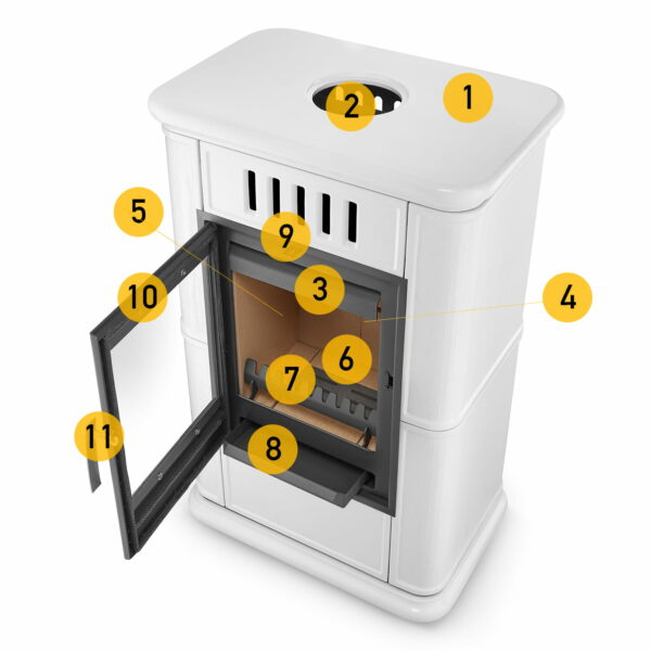 A kályhák kiváló minőségű, magas hőmérsékletnek ellenálló acélból készülnek, ami garantálja a teljes szerkezet stabilitását és hosszú élettartamát. Az égéskamra vermikulittal van bélelve, amely anyag növeli az égés hatékonyságát és megvédi az acélt a túlmelegedéstől, így garantálva, hogy a kályha sok éven át szolgálni fogja Önt.