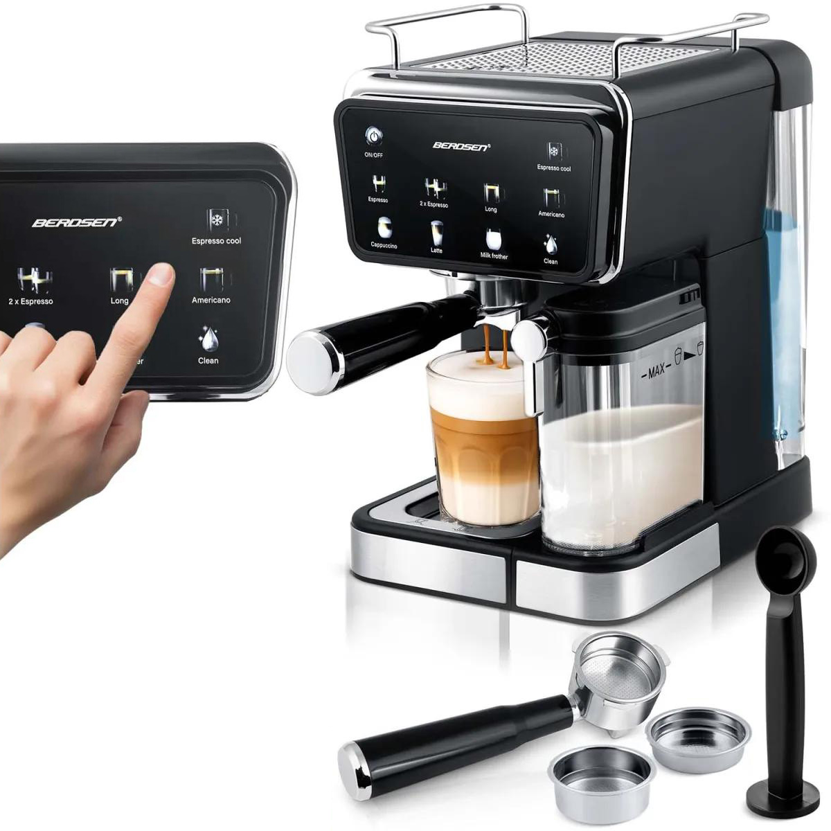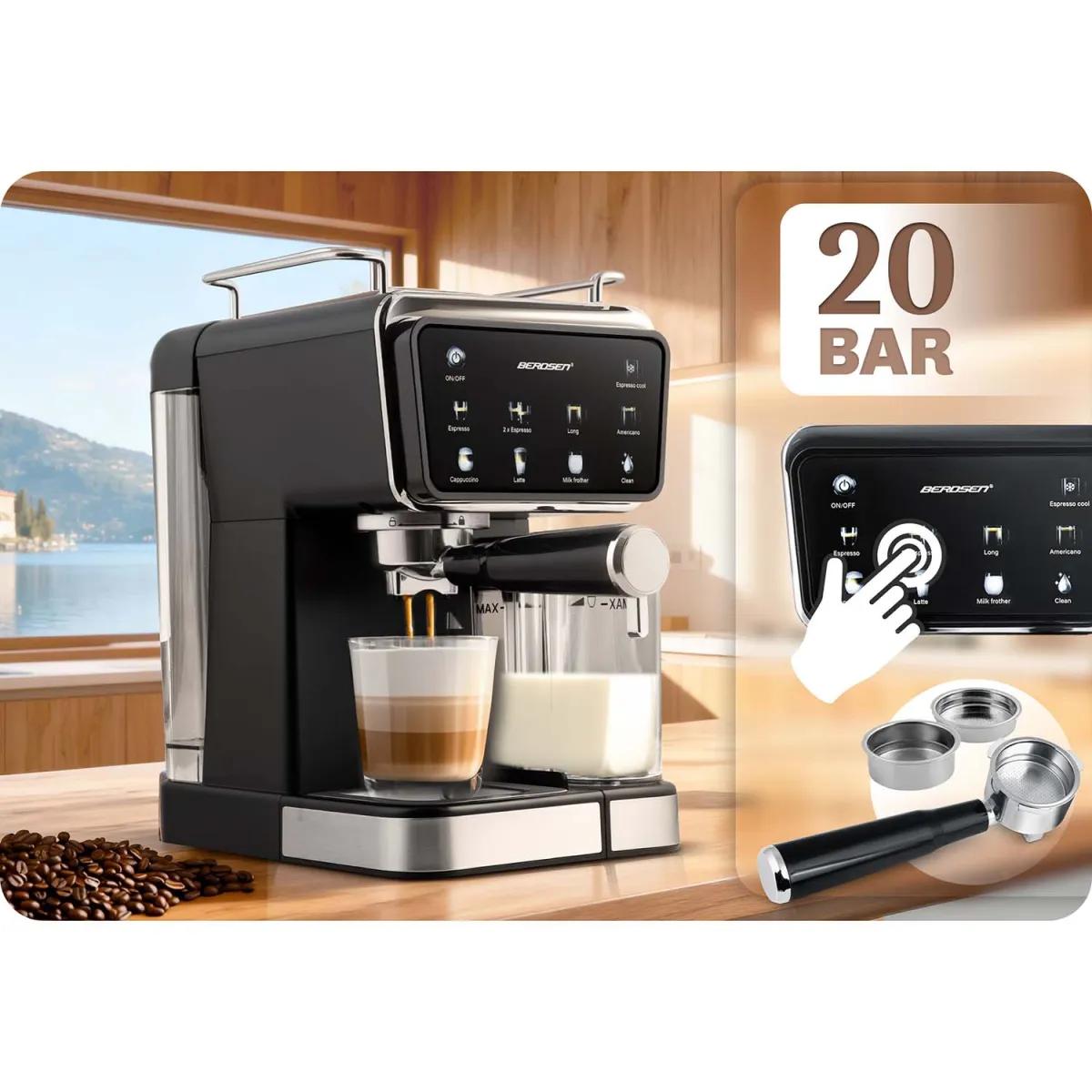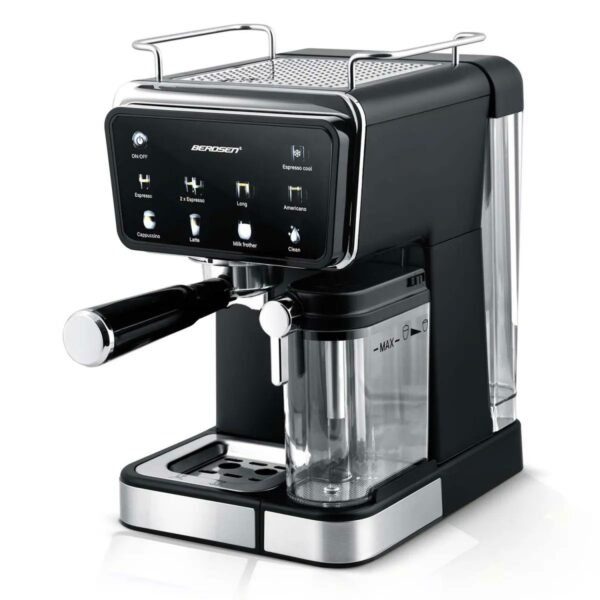 Karos kávéfőző BD-773, 20 bar, fekete | Berdsen garantálja a gazdag eszpresszó otthoni elkészítését tejhabosítási lehetőséggel. Ez egy elegáns háztartási készülék, amely kiváló minőségű kávékészítést kínál egy profi barista stílusában. A 20 bar magas nyomásnak köszönhetően tökéletesen kinyeri az aromát és az ízt az őrölt kávéból, sűrű és finom krémet hozva létre.
