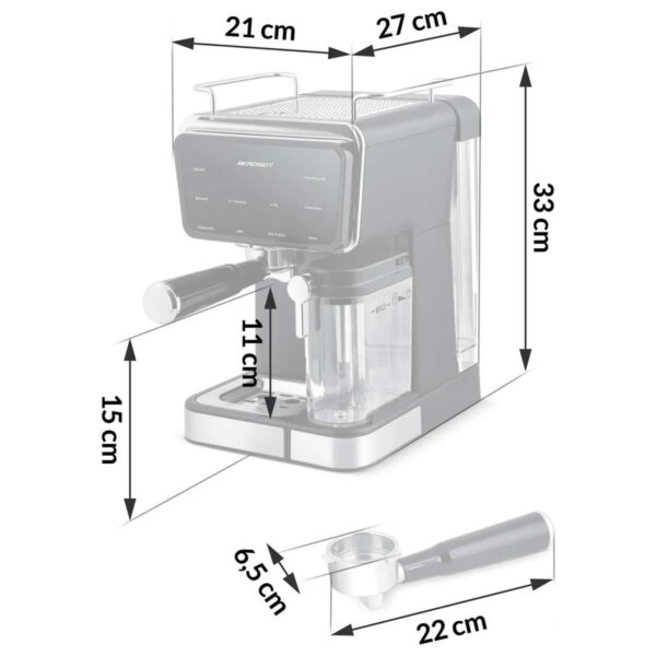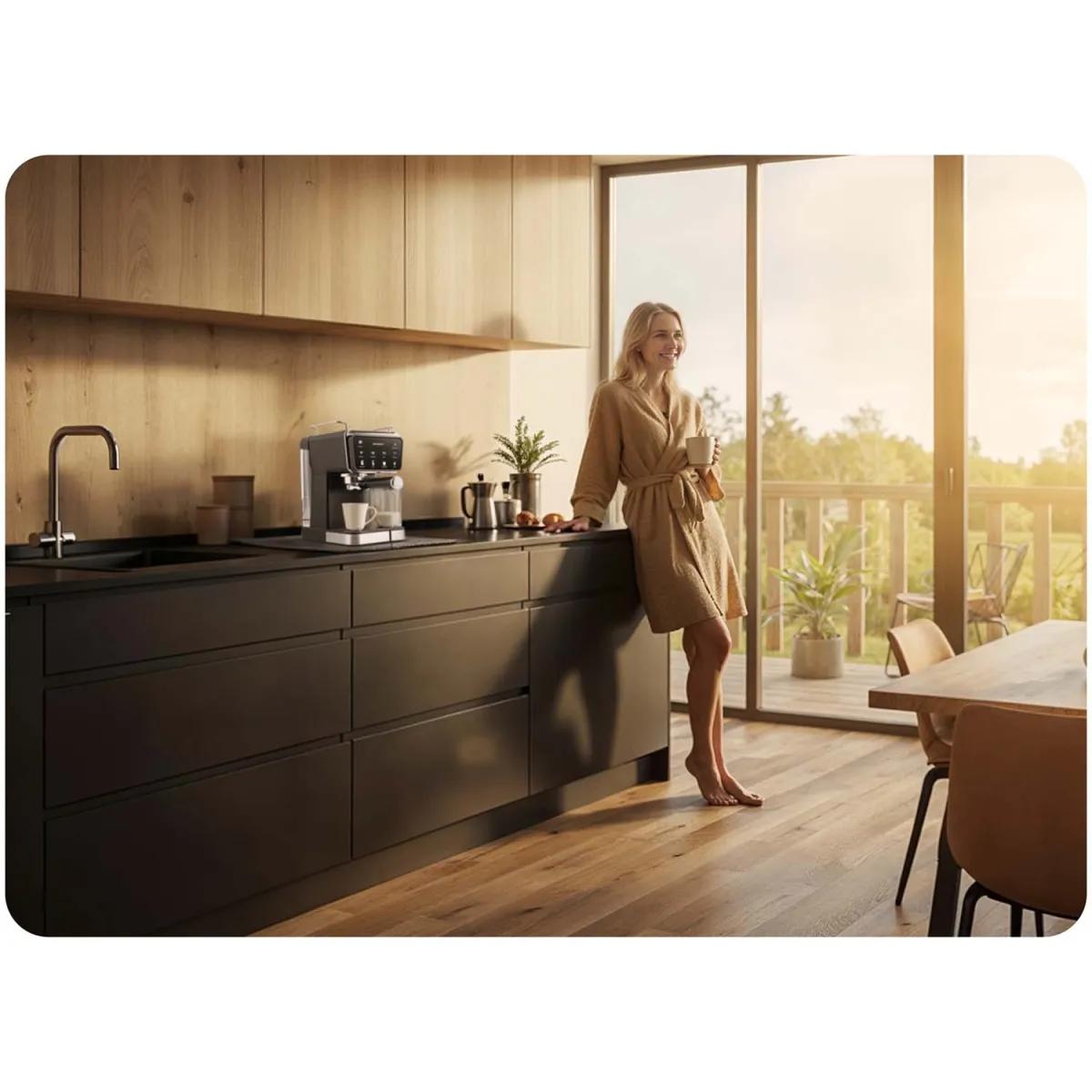 A készülék beépített tejgőzölővel is rendelkezik, amely lehetővé teszi krémes cappuccino, latte vagy más tejes specialitások egyszerű elkészítését. A kávéfőző kivehető, körülbelül 1,5 literes víztartállyal rendelkezik, amely lehetővé teszi több csésze kávé elkészítését folyamatos utántöltés nélkül.