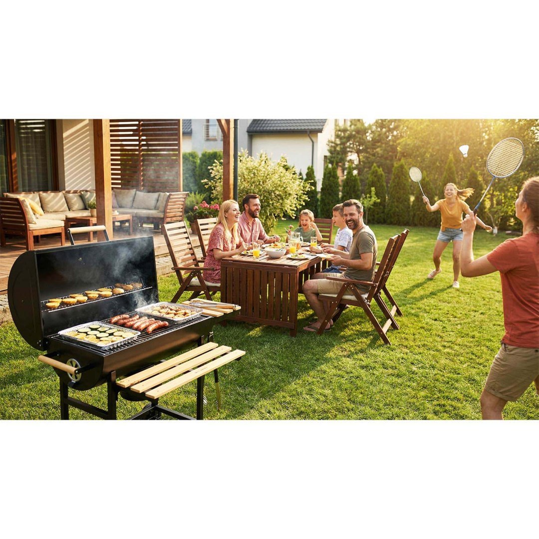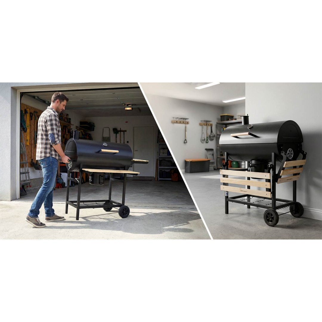 A fedővel és kéménysel ellátott kialakítás lehetővé teszi a légáramlás és a hőmérséklet jobb szabályozását grillezés közben, ami segít az ételek egyenletes sütésében. A beépített hőmérő áttekintést nyújt a grill belsejében uralkodó aktuális hőmérsékletről, és megkönnyíti az ételkészítési folyamat szabályozását. A grill praktikus tárolóhelyekkel is rendelkezik, amelyek szerszámok, hozzávalók vagy készételek tárolására szolgálnak, így minden kéznél van, amire szüksége van grillezés közben.