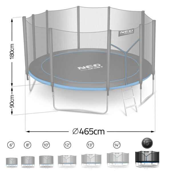 Kerti trambulin, 465cm | A Neo-Sport biztonságos és szórakoztató tevékenységet kínál gyerekeknek és felnőtteknek a kertedben. A gyártó a trambulint a maximális biztonság és kényelem érdekében tervezte. Az 5 dupla “U” alakú lábbal ellátott robusztus konstrukció stabilitást biztosít használat közben.