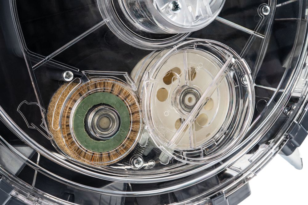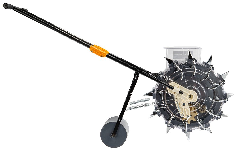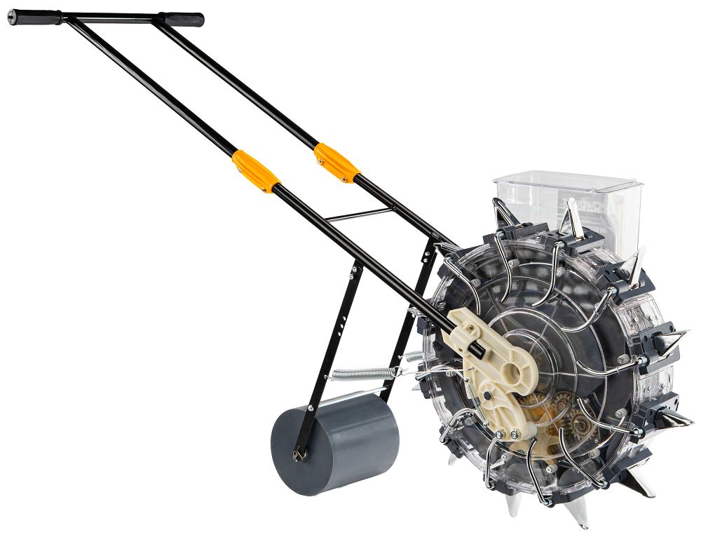 A kialakítás biztosítja a gép stabil talajvezetését, ami az egyenletes vetésben tükröződik. A nyomógörgő felelős a talaj tömörítéséért vetés után, aminek köszönhetően a magok jobban érintkeznek az aljzattal, és egyenletesek a csírázási feltételek. A 3,7 kg-os térfogat lehetővé teszi a hosszabb munkát a magok gyakori utántöltése nélkül, ami valóban felgyorsítja a teljes vetési folyamatot. Az átlátszó tartály teljes mértékben szabályozza a szintet, így nem kell váratlan pillanatban megszakítania a munkát.