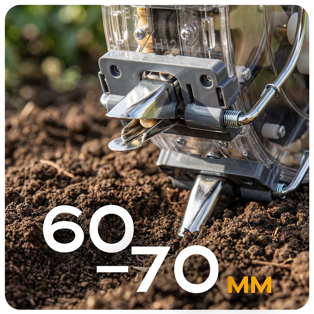 A mélységet és a vetéstávolságot beállíthatja, így a vetést kukoricához, babhoz, borsóhoz vagy szójababhoz igazíthatja. Univerzális eszközt kap különböző növényekhez anélkül, hogy a készülék cseréjére lenne szükség. A vetőgép 1-2 magot vet azonos vetéstávolsággal, aminek köszönhetően a növények optimális növekedési feltételeket biztosítanak. Kevesebb anyagveszteséget és kiszámíthatóbb eredményeket érhet el anélkül, hogy a sorokat korrigálnia kellene. A 60–70 mm-es mélységállítási opció lehetővé teszi a vetésnek a talaj és a mag típusához való igazítását.