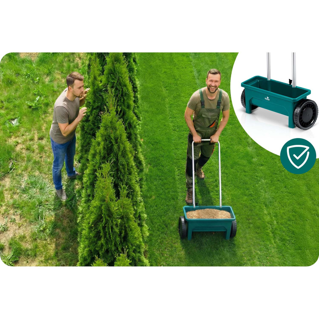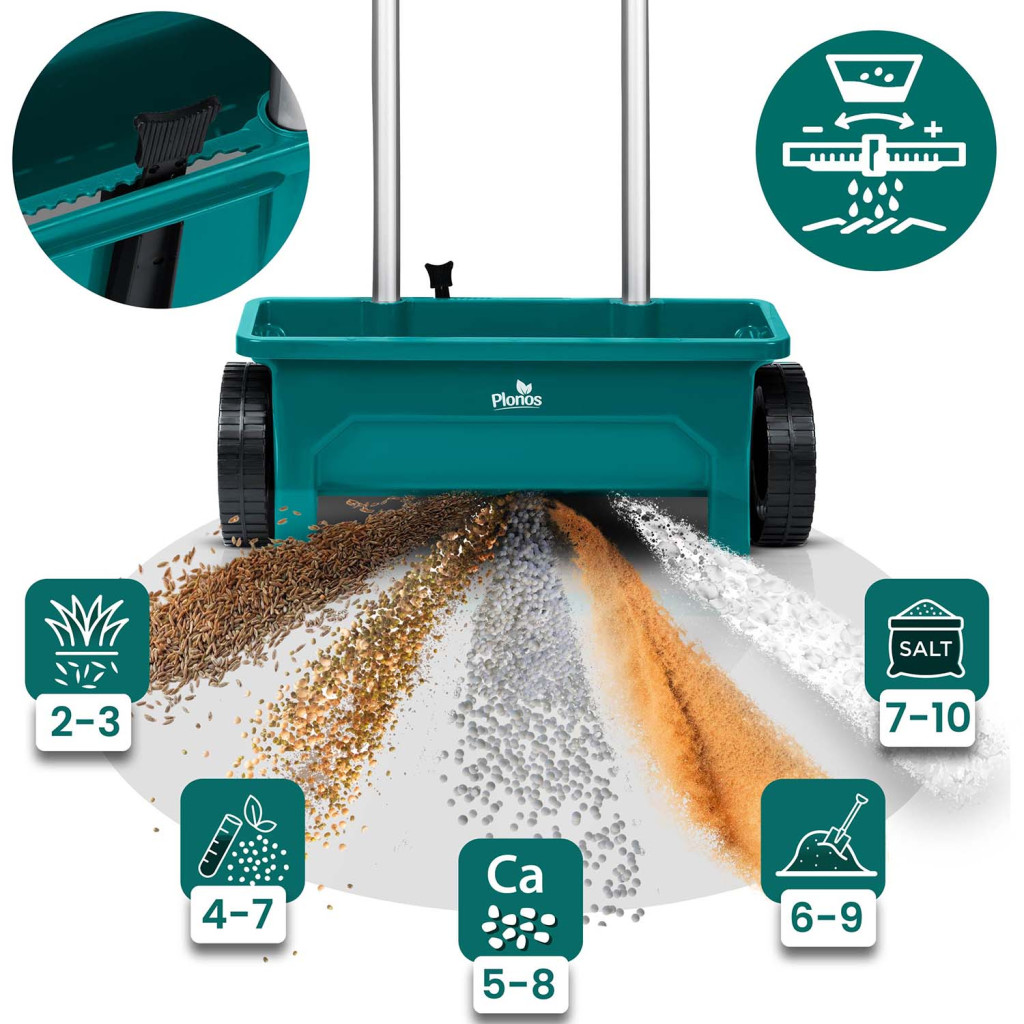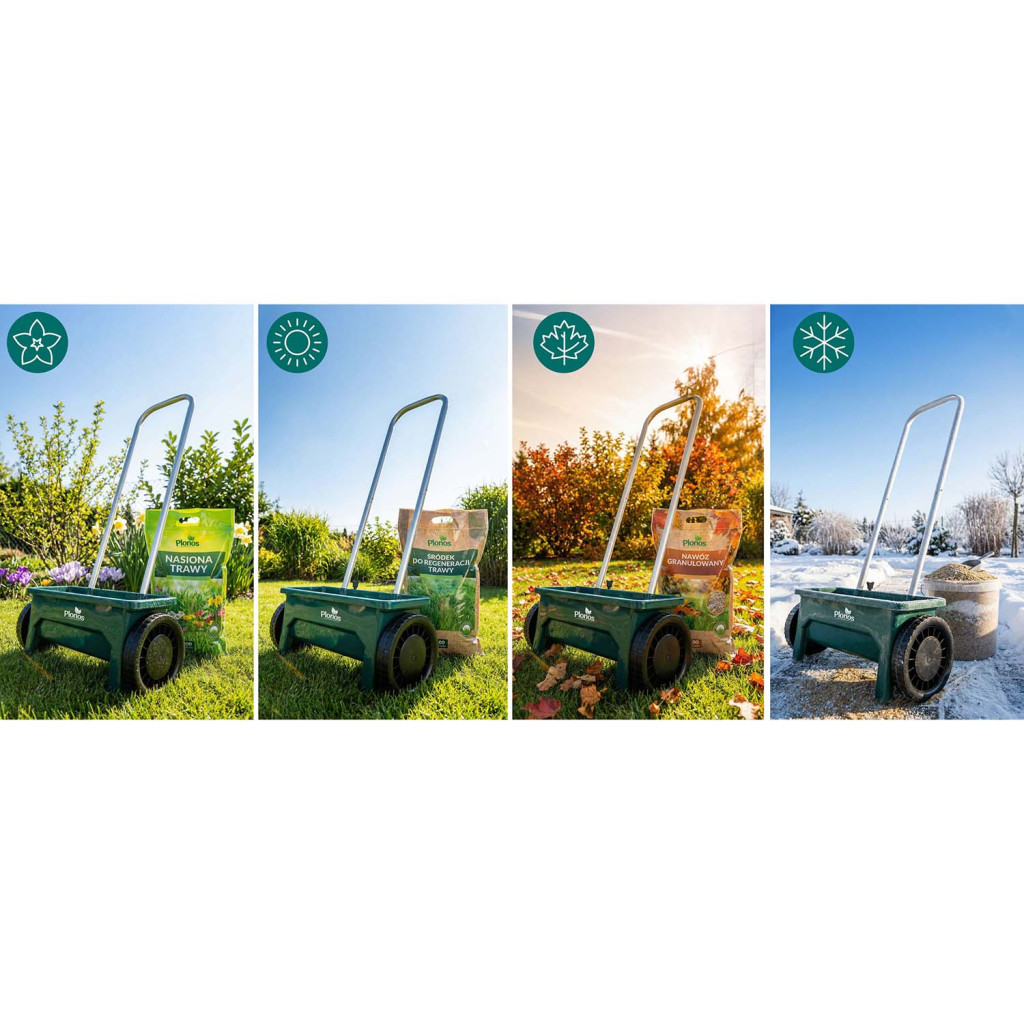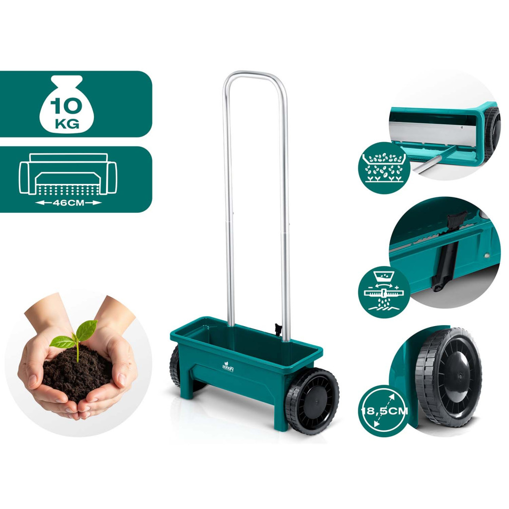 A nagy kerekek biztosítják a sima mozgást különböző felületeken, az ergonomikus fogantyú csökkenti a fáradtságot, a praktikus kar pedig lehetővé teszi a szórás azonnali leállítását a nagyobb kényelem és pontosság érdekében. A vetőgépet fű, műtrágya, homok és útsó vetésére használhatja egész szezonban, tavasztól télig, míg a tartós műanyag konstrukció hosszú élettartamot és egyszerű karbantartást garantál.