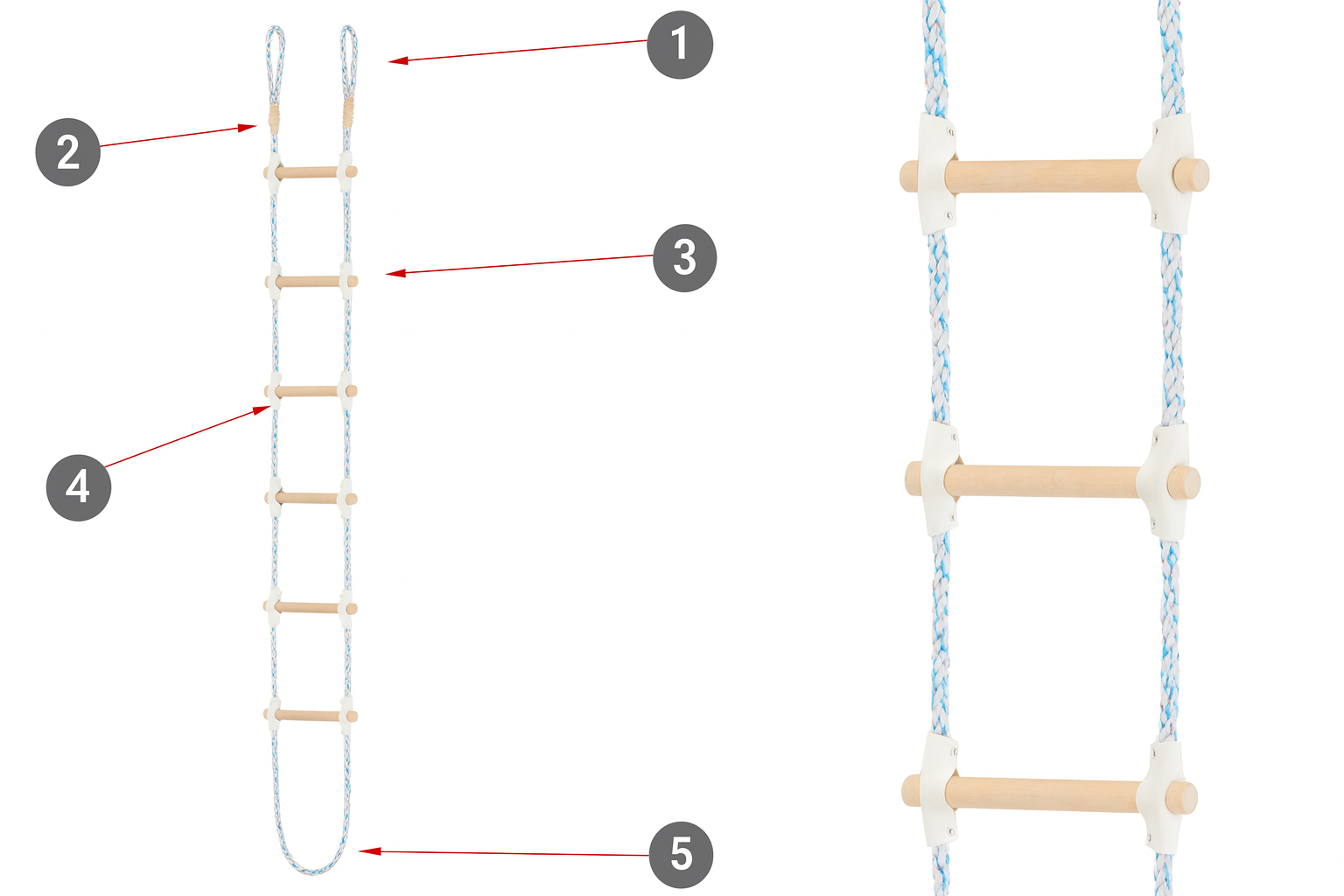 A tartósság és a biztonság növelése érdekében minden keresztléc mindkét végén öko-bőr védőburkolatokat (huzatokat) használtak, amelyek fontos szerepet játszanak. Ezek védik a létrafokok főkötélhez való rögzítésének helyét a kopástól és a sérülésektől. Kiváló védelmet nyújtanak a létrafokok kemény felületei által okozott karcolásokkal szemben.