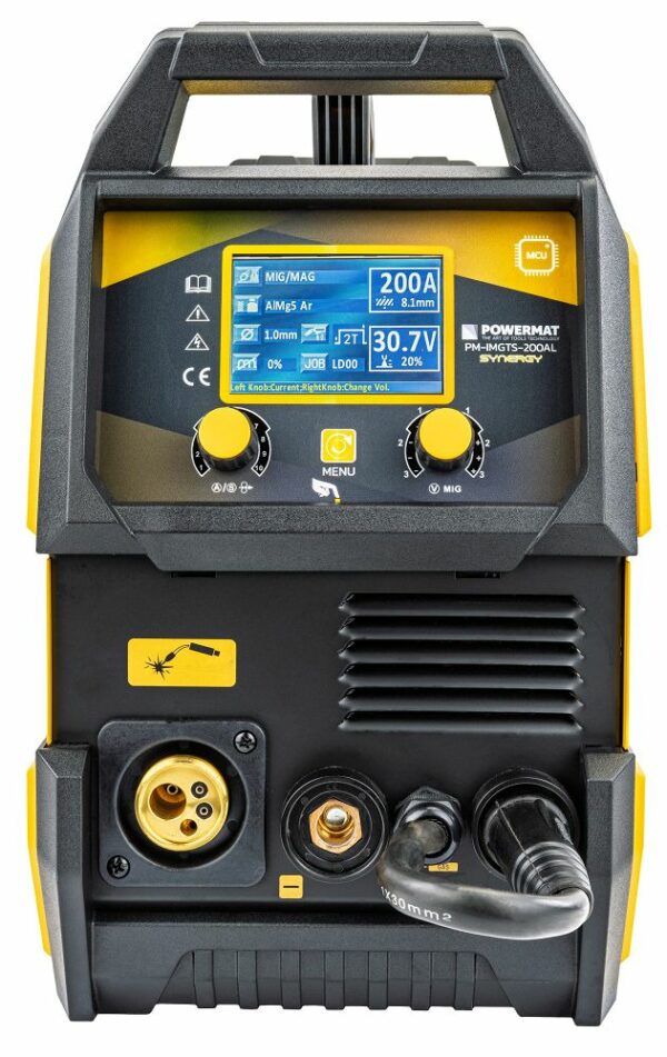 A Migomat inverteres hegesztő, 11,3 kVA | PM-IMGTS-200AL lehetővé teszi különféle anyagcsoportok hatékony hegesztését széles anyagvastagság-tartományban. Az alkalmazott IGBT tranzisztorok pozitív hatással vannak az alacsonyabb energiafogyasztásra, a nagyobb zavar- és feszültségesés-tűrésre, valamint a jó ívtulajdonságokra. A kezelőpanel most még könnyebben használható, és a kezelő gyorsan hozzáférhet minden funkcióhoz. Ez pozitív hatással van az ergonómiára és a munka hatékonyságára az üzemben.