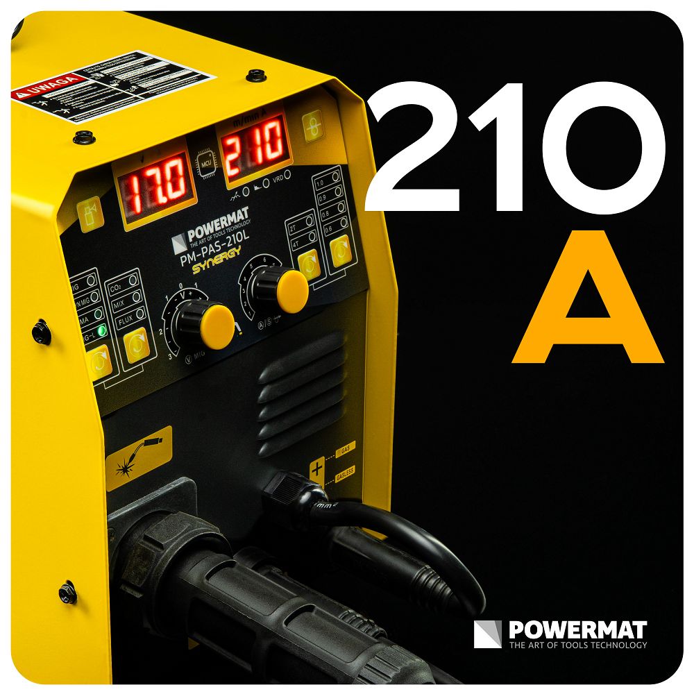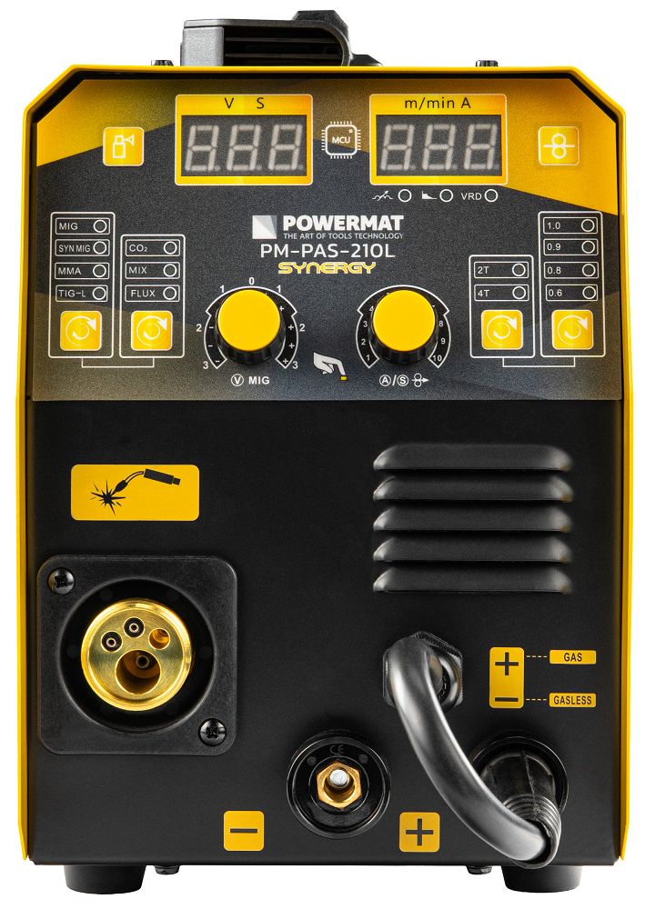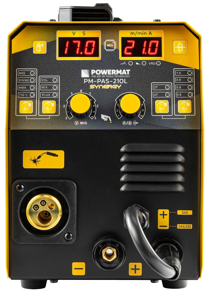 A Migomat Inverteres Hegesztő | PM-PAS-210L egy univerzális eszköz MIG/MAG, FLUX, MMA és TIG LIFT hegesztéshez, amely műhelyben és terepen is bizonyítja létjogosultságát. Az IGBT technológia és a szinergia mód megkönnyíti a paraméterek kiválasztását, aminek köszönhetően stabil ívet és ismételt hegesztéseket kap. Az LCD kijelző, az impulzus funkció és a hűtőrendszer növeli a munka kontrollját, pontosságát és biztonságát. A szinergia mód automatikusan kiválasztja az anyag és a gáz paramétereit. Ön a hegesztésre koncentrál, nem a beállításokra.