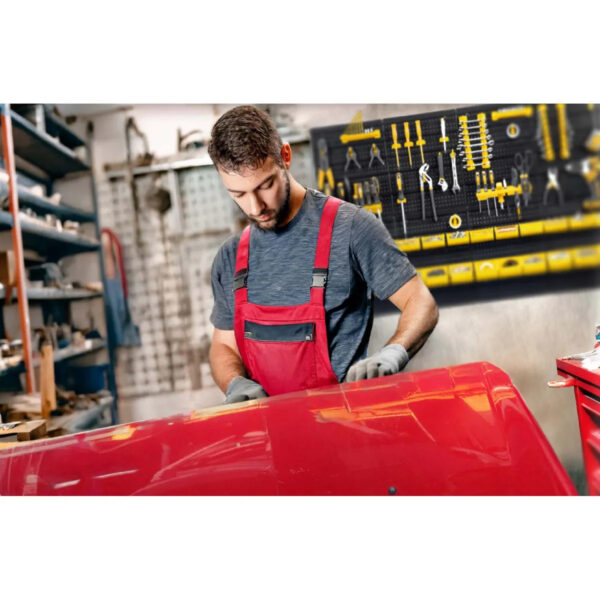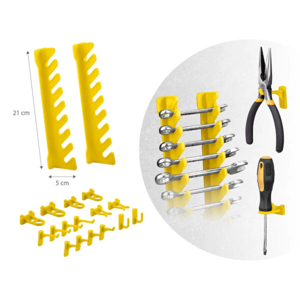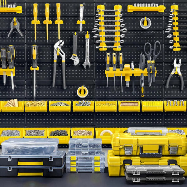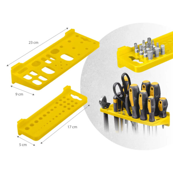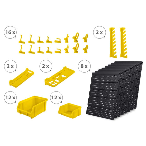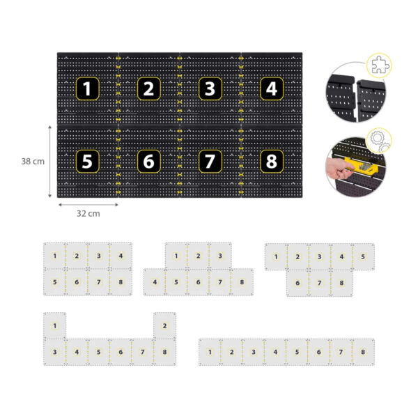 A panel 6 moduláris részből áll, amelyek egyetlen felületté kapcsolódnak össze. A gyártó a tartósságra helyezett hangsúlyt fektetve választotta ki az anyagokat – a tartós műanyag alkatrészek kiegészítik a panel robusztus alapját. Ennek a terméknek köszönhetően hatékonyan használhatja a falat csavarok, szerszámok, villáskulcsok és nagyobb alkatrészek rendszerezésére, miközben minden szerszámnak megvan a saját fix helye, és mindig kéznél van.
