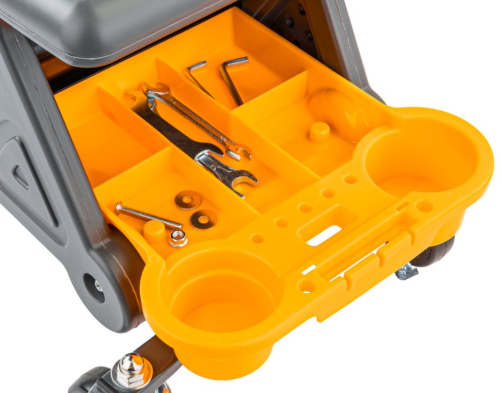A szék három kivehető fiókkal van felszerelve, amelyek lehetővé teszik a szerszámok, csavarok és apró tárgyak kényelmes tárolását közvetlenül a munkahelyen. Ez a megoldás javítja a munkaszervezést, csökkenti a tartozékok keresésével töltött időt, és növeli a hatékonyságot a javítások és az összeszerelés során. Az ülés fékezhető szállítókerekekkel van felszerelve, amelyek lehetővé teszik a munkahelyen való zökkenőmentes mozgást és a gyors rögzítést munka közben.