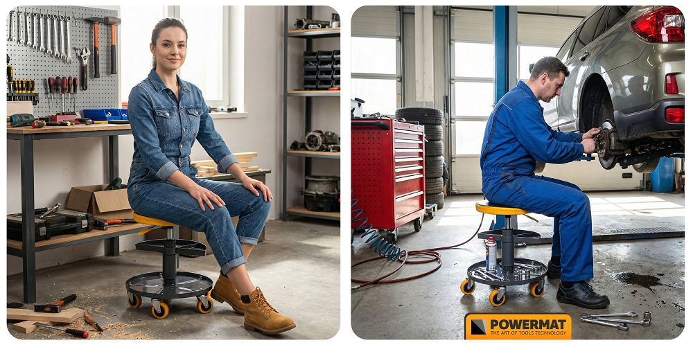 Az ülés méretei 35,5 × 40 × 40 cm, így könnyen elhelyezhető a munkaterületen, és kényelmesen tárolható még egy kisebb garázsban is. A szék robusztus konstrukcióját a gyártó igényes munkákhoz tervezte, és akár 150 kg teherbírást biztosít. Ez garantálja a stabilitást és a biztonságos használatot mind az otthoni garázsban, mind a professzionális műhelyekben.