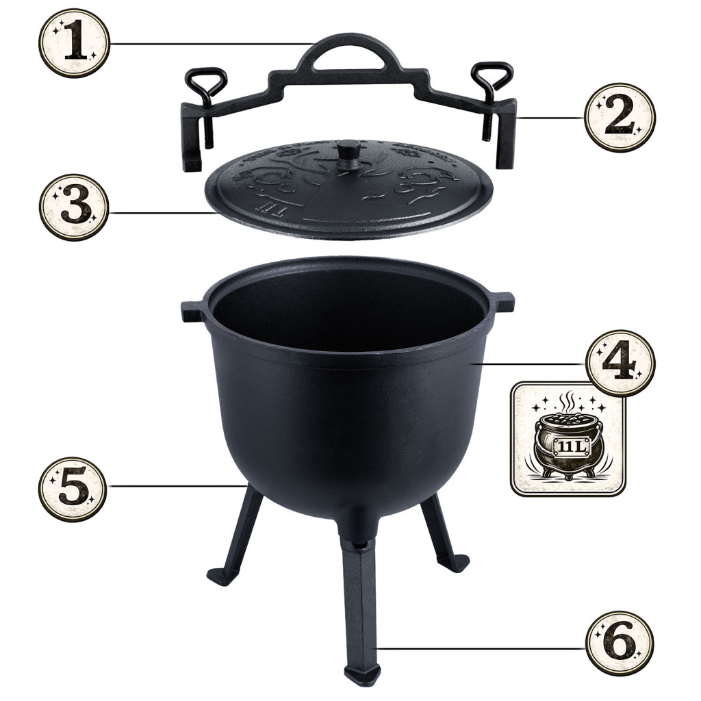 Az öntöttvas üst, BD-482, 8L | Berdsen egy praktikus edény tűzön vagy grillen történő ételek elkészítéséhez, amely alkalmas különféle kültéri főzéshez és összejövetelekhez. A masszív öntöttvas konstrukció egyenletes hőeloszlást és hosszú távú hőtartást biztosít, aminek köszönhetően az ételek hatékonyan és egyenletesen készülnek el. A konstrukció lehetővé teszi a közvetlen tűzben vagy a tűz fölé akasztva történő használatot, míg a masszív anyagok biztosítják a hőmérséklettel és a mechanikai sérülésekkel szembeni nagy ellenállást.