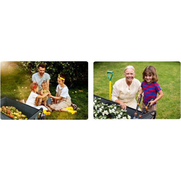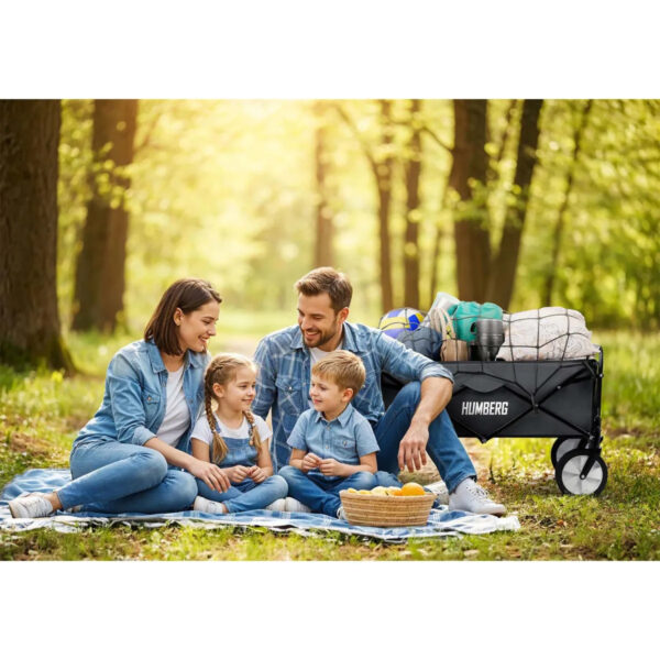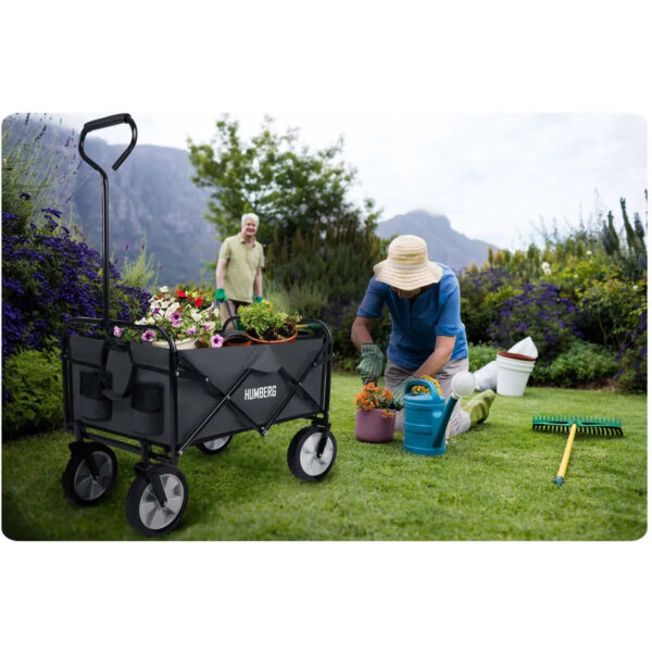 Összecsukható hálós kocsiHM-511, 80L | Humberg robusztus konstrukciót, gyors összecsukást és a rakomány rögzítésére szolgáló hálót kínál a kényelmes kezelés érdekében. Sokoldalú segítőként szolgálhat otthoni, kerti vagy kirándulásokon történő rakományszállításhoz. Masszív, porfestett acélvázzal, csak elöl forgatható kerekekkel rendelkezik a könnyebb manőverezés érdekében, valamint ergonomikus, csúszásmentes felületű fogantyúval a kényelmes irányítás érdekében.