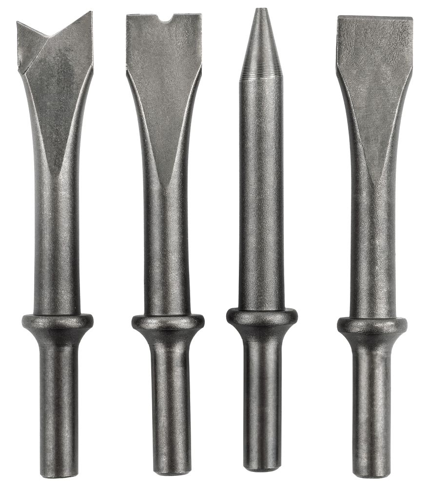 A kalapács teljes mértékben kompatibilis a szabványos 10 mm-es szárú pneumatikus vésőkkel. Lehetővé teszi a piacon kapható cserélhető szerszámok széles választékával való használatát, például lapos-, hegyes- és horonyvésőkkel. Azonban… Ez a készlet már tartalmaz négy professzionális, edzett acélból készült, 10 mm-es szárhoz igazított pneumatikus vésőt. Mindegyikük más funkciót lát el, így sokoldalúan használható műhelyi és felújítási munkákban.