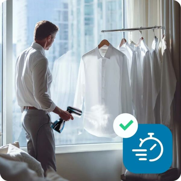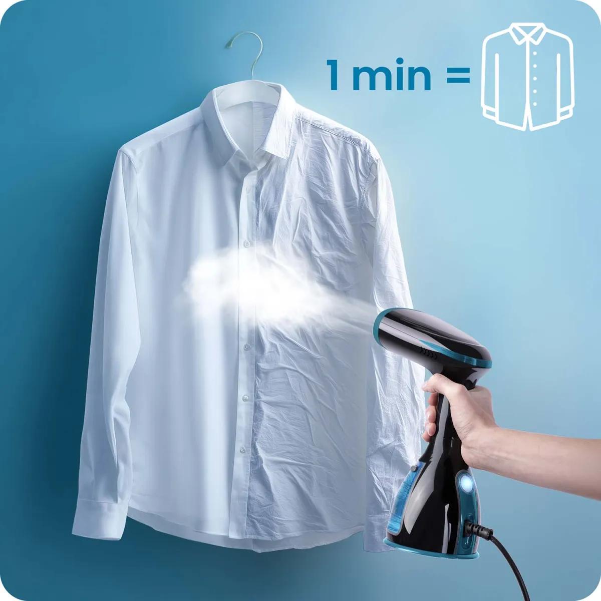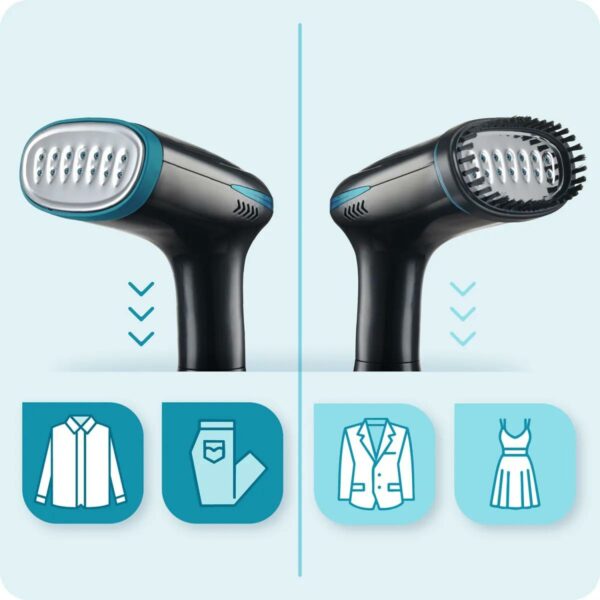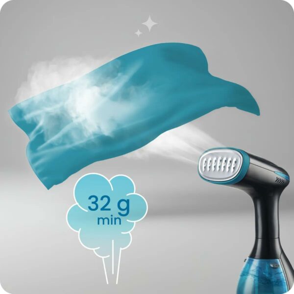 A gyengéd gőzölésnek köszönhetően kényes anyagokhoz, például selyemhez, blúzokhoz vagy függönyökhöz is alkalmas. A 280 ml-es víztartály több perces folyamatos működést tesz lehetővé, és könnyen leválasztható és újratölthető. A vezérlés nagyon egyszerű – csak egy gomb, amelyet egy működésjelző lámpa egészít ki.