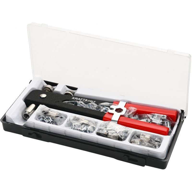 Szegecsfogó + tartozékok | KD11299 egy tartós és funkcionális kézi szegecselő szerszám szegecsanyákhoz, professzionális és amatőr használatra tervezve. Ideális műhelyekbe, garázsokba és építkezésekre, ahol lehetővé teszi a szegecsanyák gyors és precíz beszerelését menetvágás nélkül.