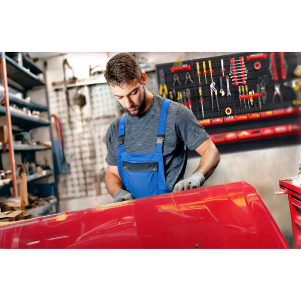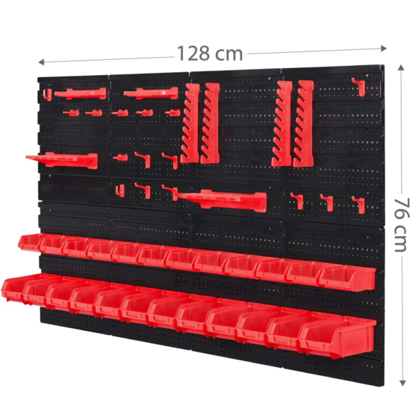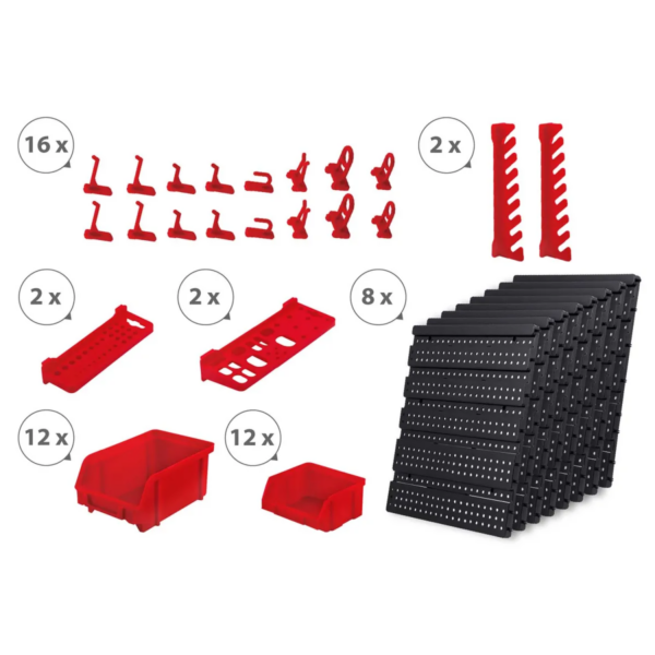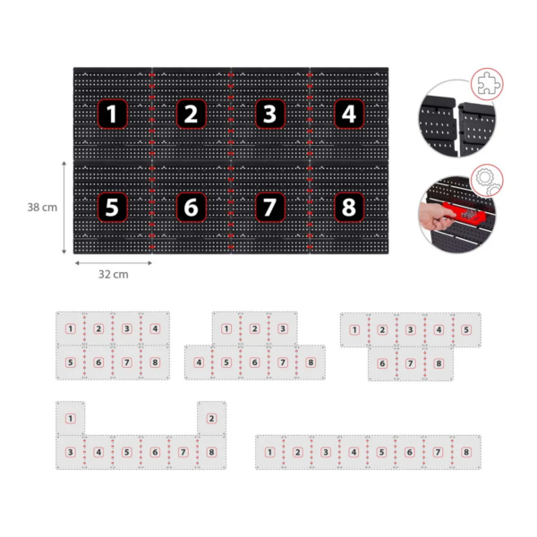 A panel 6 moduláris részből áll, amelyek egyetlen felületté kapcsolódnak össze. A gyártó a tartósságra helyezett hangsúlyt fektetve választotta ki az anyagokat – a tartós műanyag alkatrészek kiegészítik a panel robusztus alapját. Ennek a terméknek köszönhetően hatékonyan használhatja a falat csavarok, szerszámok, villáskulcsok és nagyobb alkatrészek rendszerezésére, miközben minden szerszámnak megvan a saját fix helye, és mindig kéznél van.
