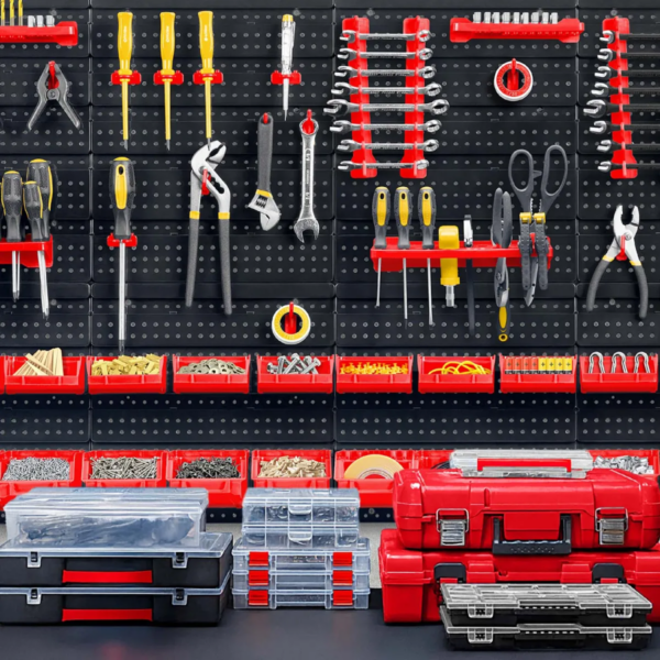 Szerszámfal HM-580, 128x76cm | Humberg egy praktikus rendszerező panel, amely segít rendben tartani a műhelyét. A készlet akár 54 kiegészítőt is tartalmaz (küvetták, kampók, polcok, tartók), amelyeket a felhasználó szabadon elhelyezhet saját igényei szerint, ami lehetővé teszi a munkaterület teljes, egyedi kialakítását.