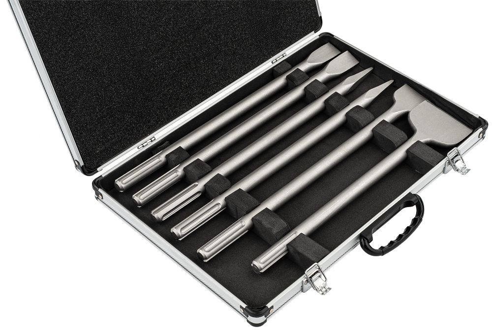 A készlet lapos és hegyes vésőket tartalmaz betonhoz, téglához és kőhöz, 25, 50 és 80 mm szélességben, amelyek lehetővé teszik a precíz vágást és a gyors anyageltávolítást tisztább élekkel és kevesebb korrekciós igényrel. A teljes készlet egy praktikus tokban tárolható, ahol minden elemnek megvan a saját helye, ami megkönnyíti a rendszerezést, biztonságos tárolást és kényelmes szállítást biztosít; A zár megvédi a tartalmat a kinyílástól vagy kiömléstől, és biztosítja, hogy a készlet biztonságosan zárva maradjon.