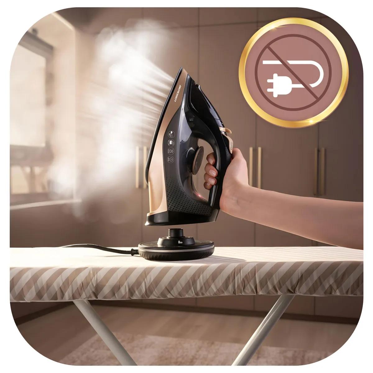 - Vezeték nélküli és klasszikus 2 az 1-ben – nincs több kábelhossz-korlátozás! Ha szeretné, a talpat véglegesen is rögzítheti, és normál vasalóként használhatja.