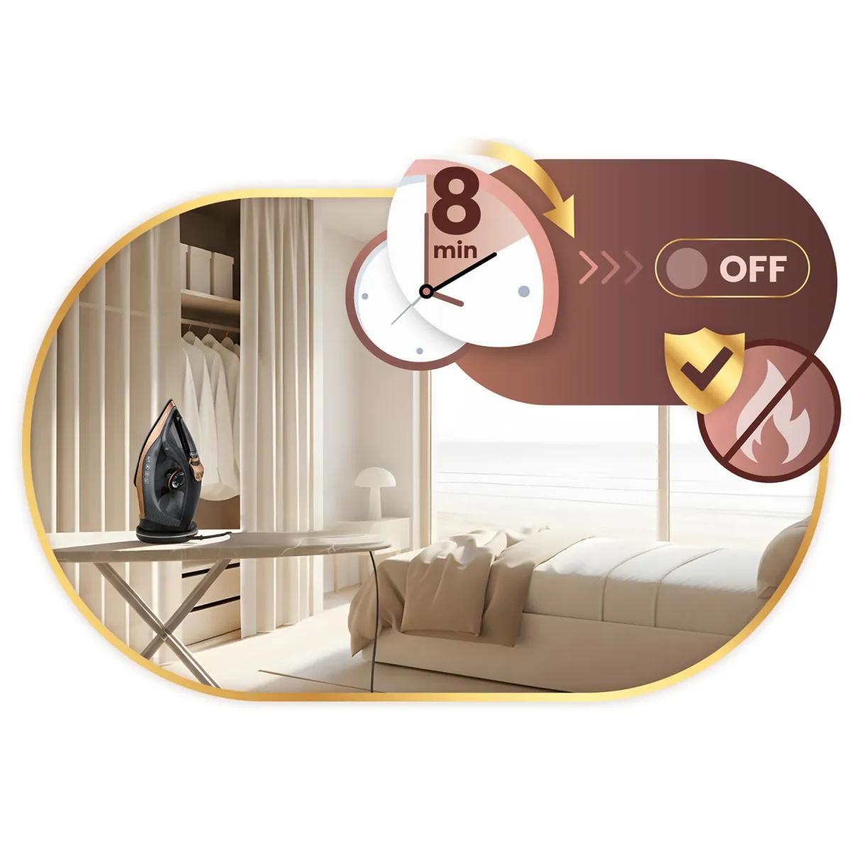 A biztonságot a néhány perc inaktivitás utáni automatikus kikapcsolás, valamint a túlmelegedés vagy csöpögés elleni rendszer garantálja. A vezeték nélküli működés, a teljesítmény, a kerámia vasalótalp és a biztonsági funkciók kombinációjának köszönhetően ez a vasaló praktikus és megbízható segítőtárs a háztartásban.