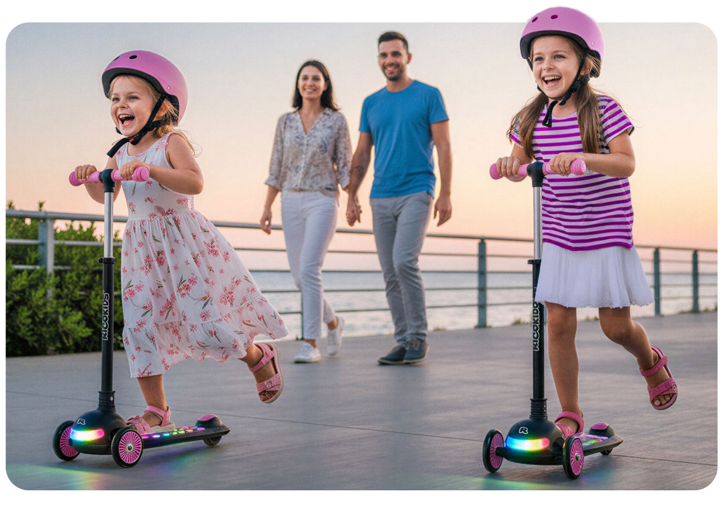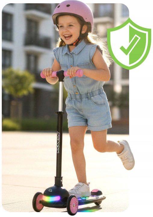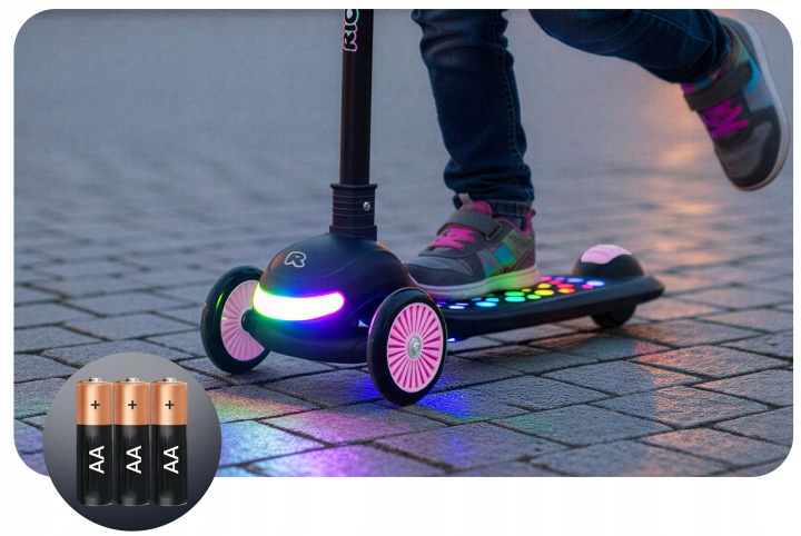 Világítós háromkerekű roller, fekete-rózsaszín | A Ricokids Glowi stabil utazást és könnyű irányíthatóságot kínál, támogatva az egyensúly és a koordináció fejlődését. A könnyű konstrukció könnyű kezelhetőséget és jó irányíthatóságot tesz lehetővé vezetés közben. A modell világító LED elemekkel van felszerelve, amelyek növelik a láthatóságot, és egyúttal vonzóbbá teszik a vezetést, különösen rossz fényviszonyok között.